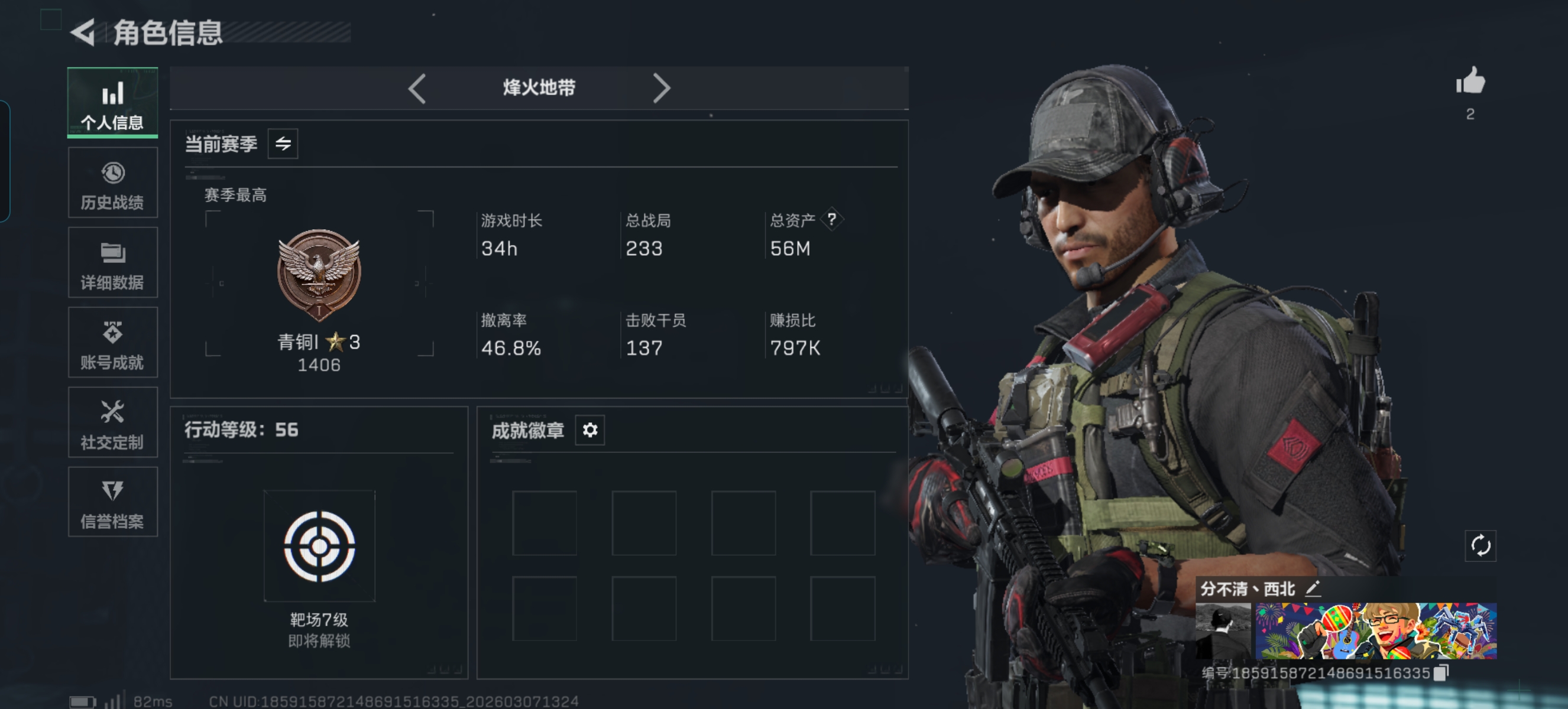 烽火段位暂无段位 战场段位列兵2 总资产188.5M 哈夫币7671W