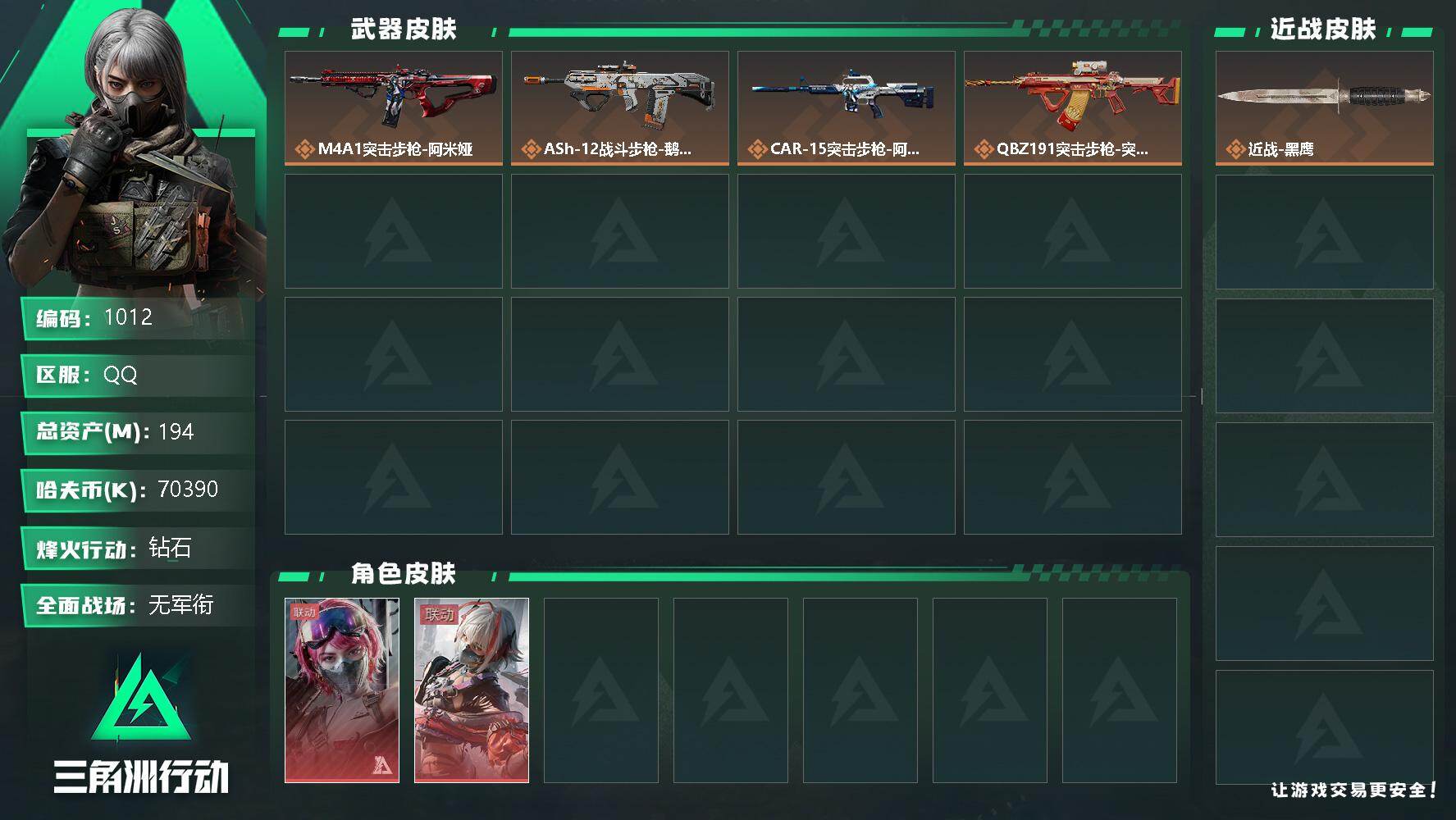 总资产:194.4M,哈夫币:7039W,武器皮肤63,烽火60级:钻石,战场