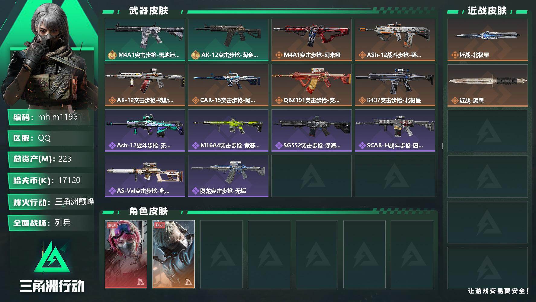 总资产:223.3M,哈夫币:1712W,武器皮肤130,烽火60级:三角洲巅
