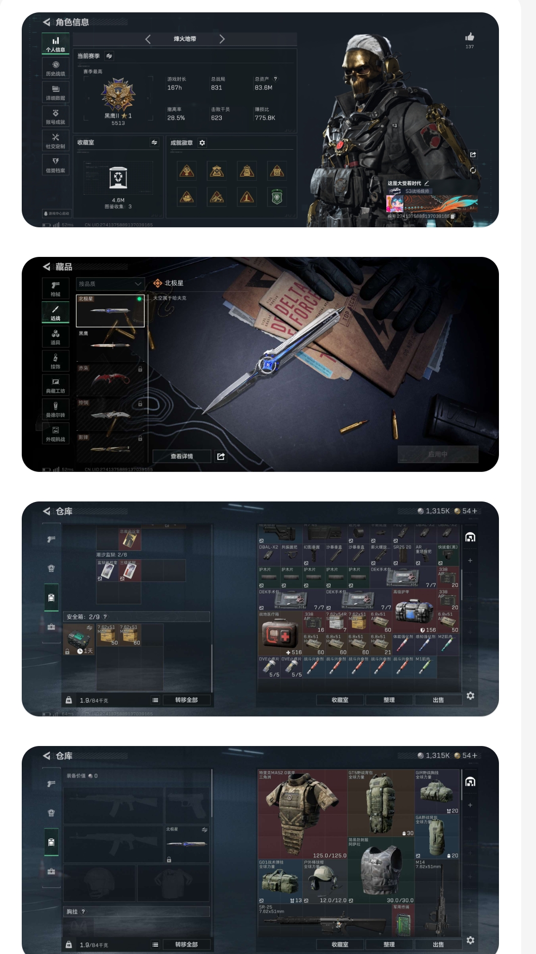 总资产159.2m 流动资产130.4m 哈夫币858k 2红皮带飞虎 1刀 1典藏枪皮 顶级安全箱