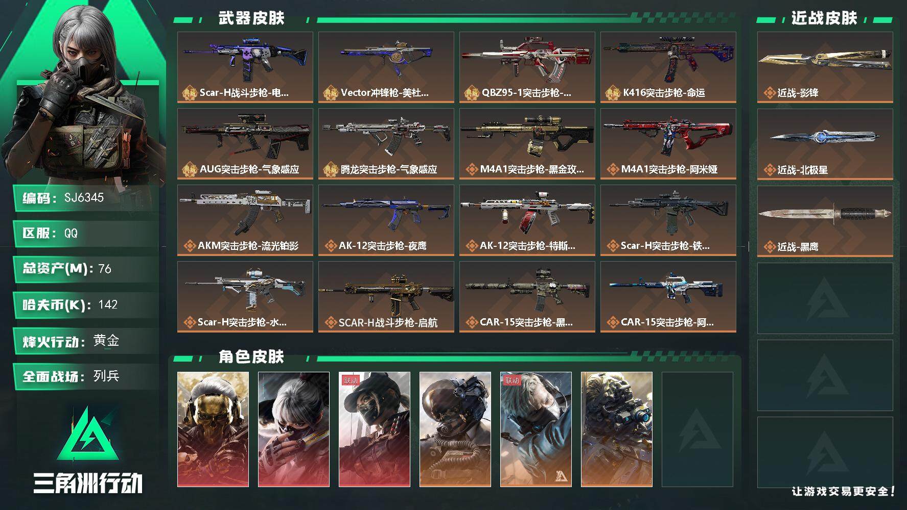 总资产(M):76M/哈夫币(K):142K/传说枪皮数:40/全面战场等级:31_段位:列兵/烽火地带等级:60_段位:黄金