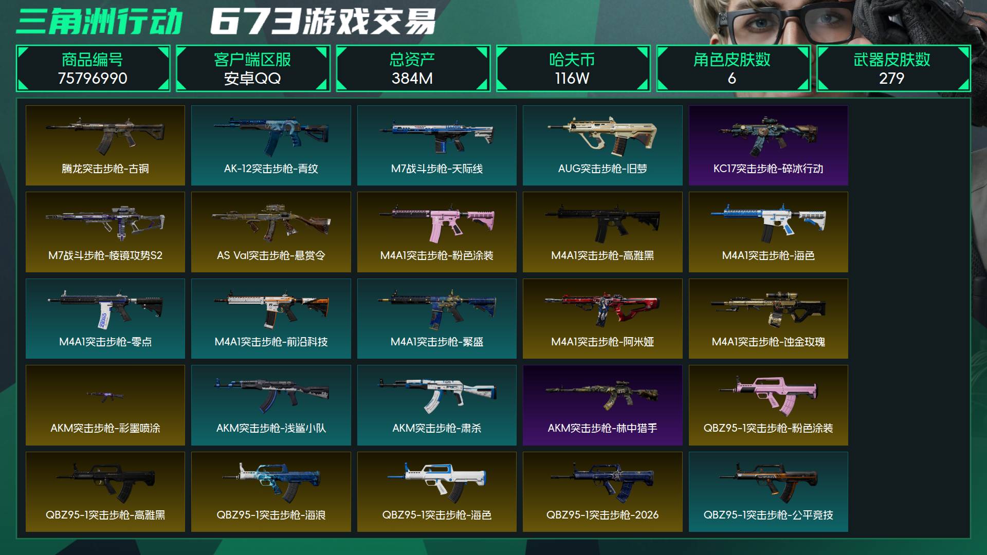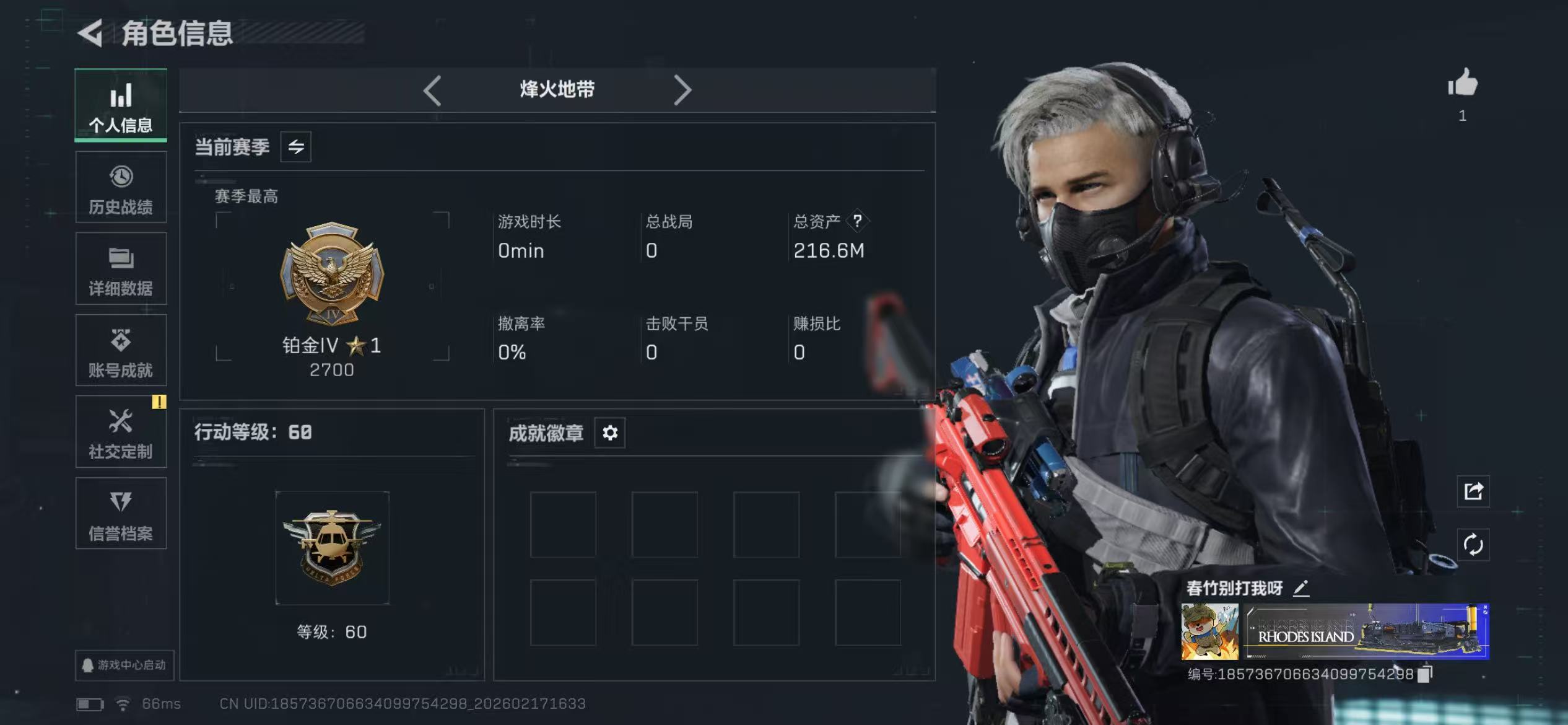 烽火段位三角洲巅峰 战场段位上等兵1 总资产384M 哈夫币116W 干员6 挂饰27 近战3 枪械279 载具61