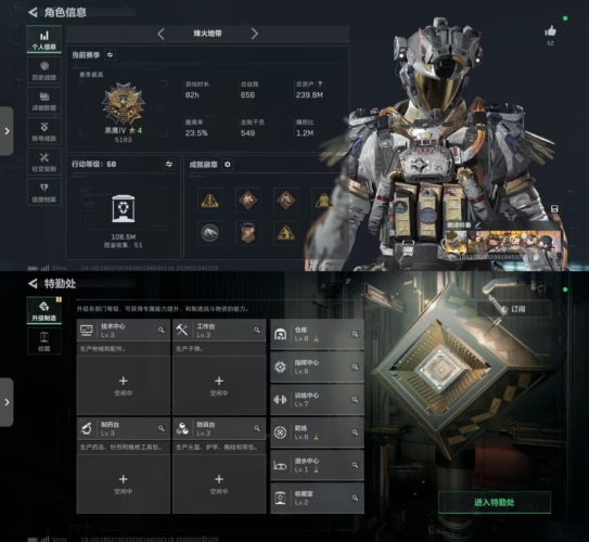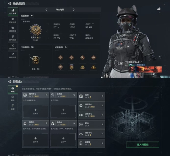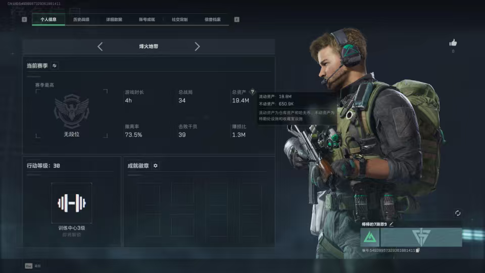 总资产(M):203M/哈夫币(K):1394K/传说枪皮数:33/全面战场等级:50_段位:校官/烽火地带等级:60_段位:钻石/