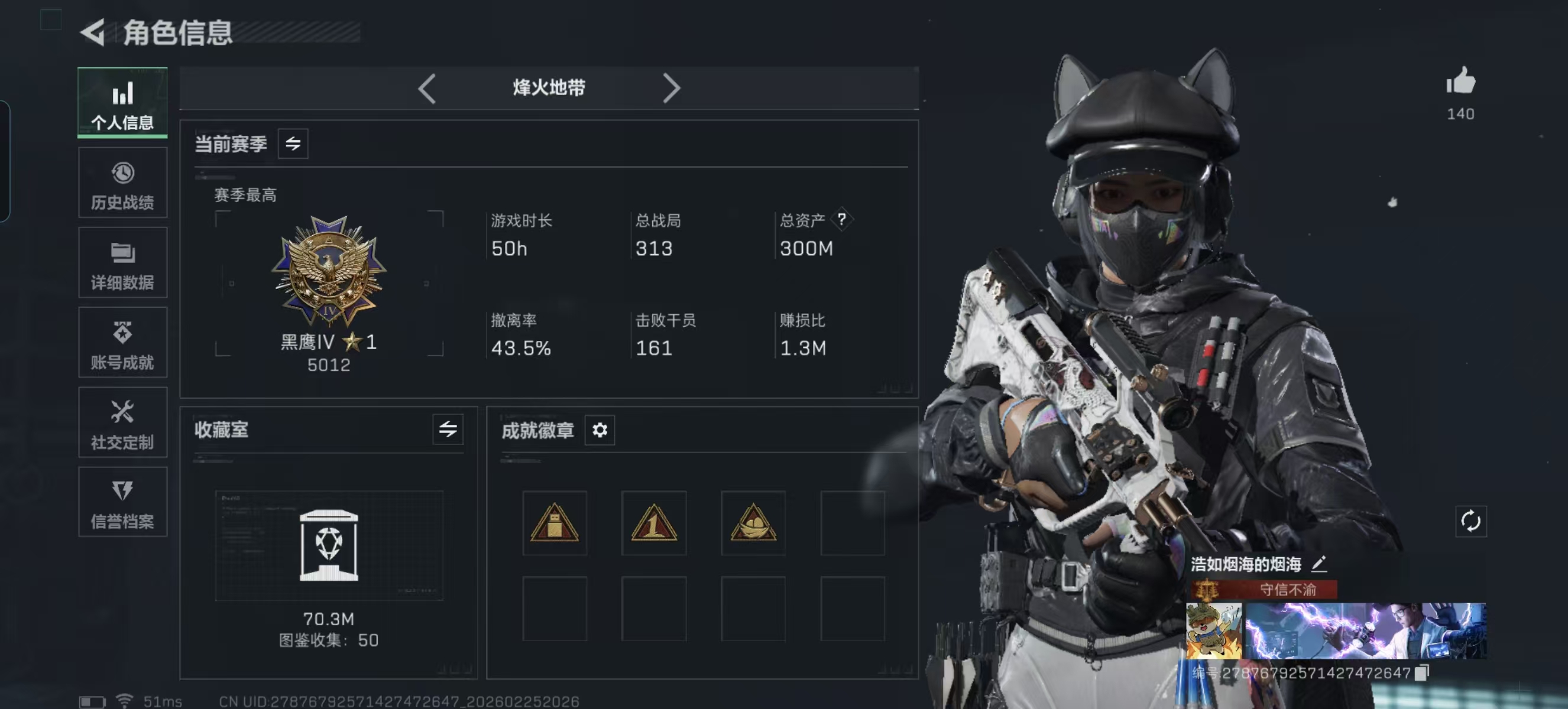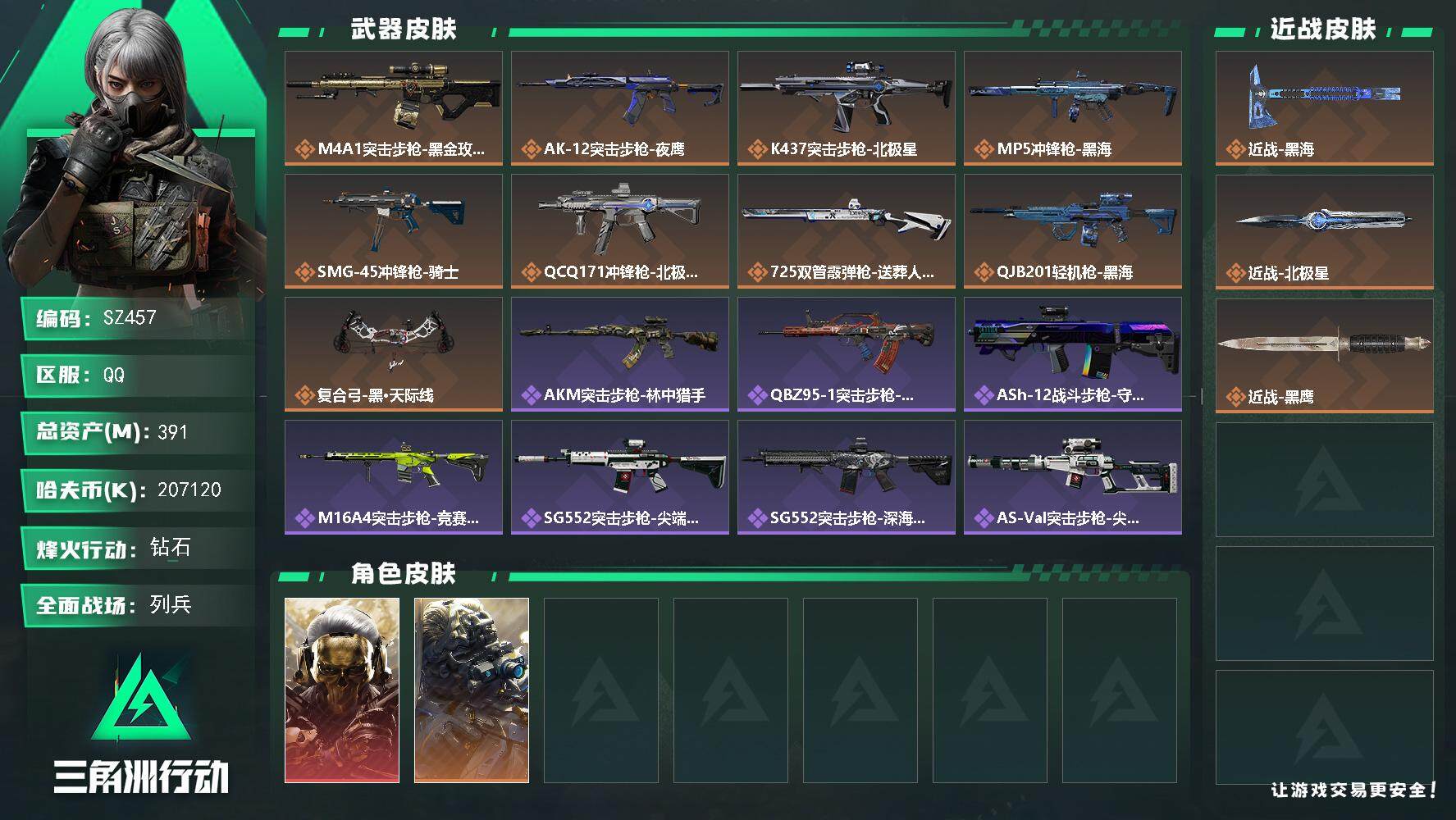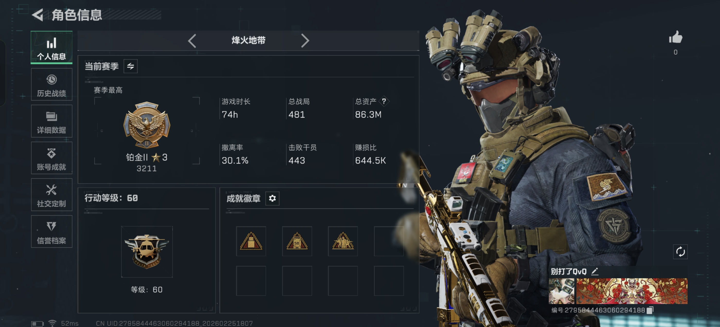 总资产(M):213M/哈夫币(K):30298K/传说枪皮数:32/全面战场等级:50_段位:尉官/烽火地带等级:60_段位:钻石/