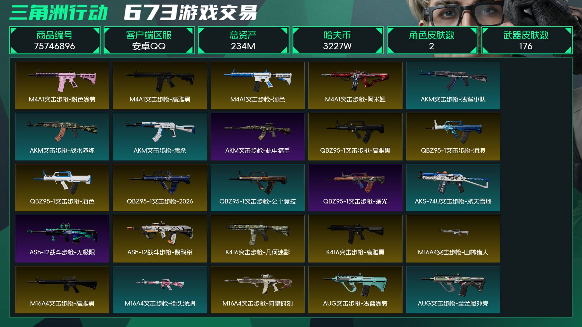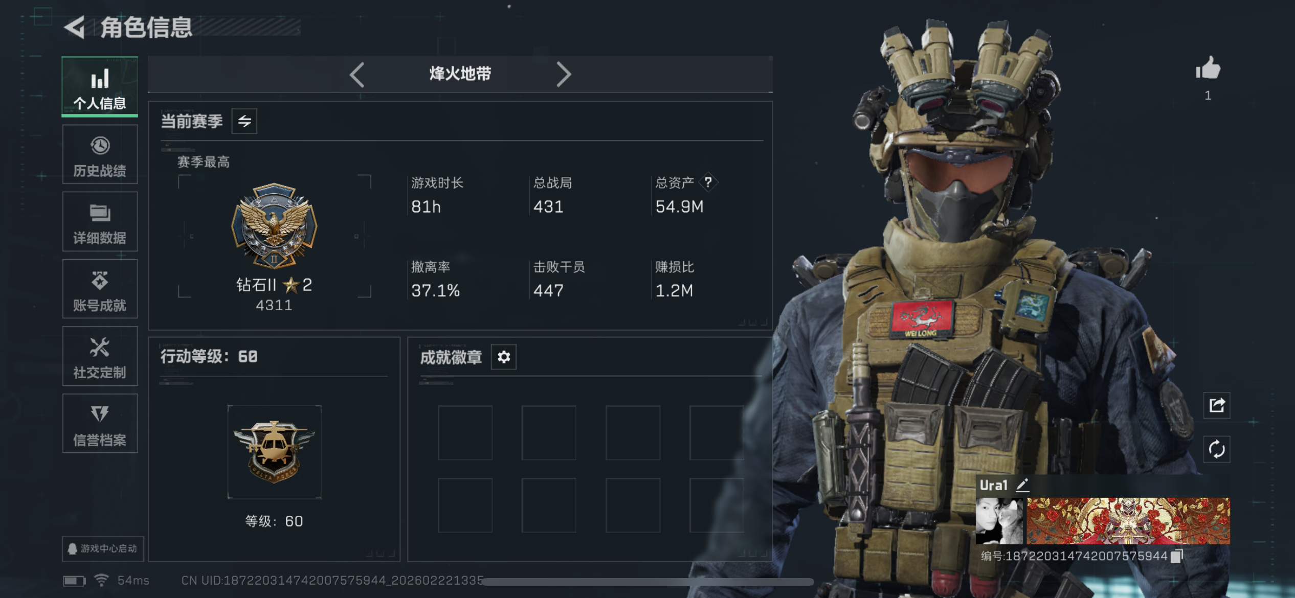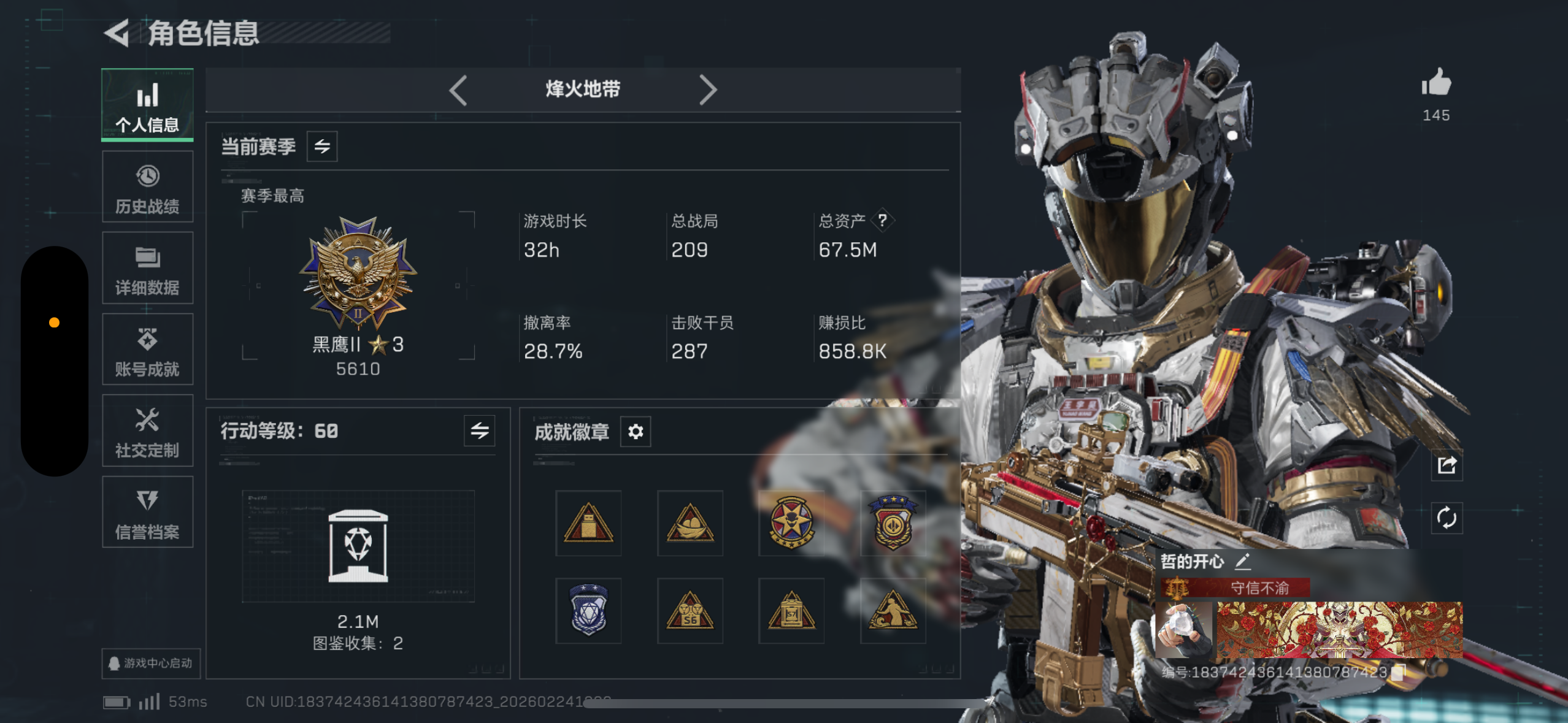 烽火段位铂金1 战场段位军士长2 总资产234M 哈夫币3227W 干员2 挂饰29 近战1 枪械176 载具37