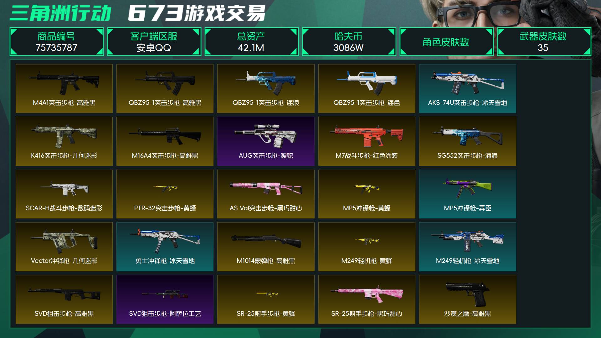 烽火段位白银2 战场段位暂无段位 总资产42.1M 哈夫币3086W 挂饰3 近战1 枪械35 载具1