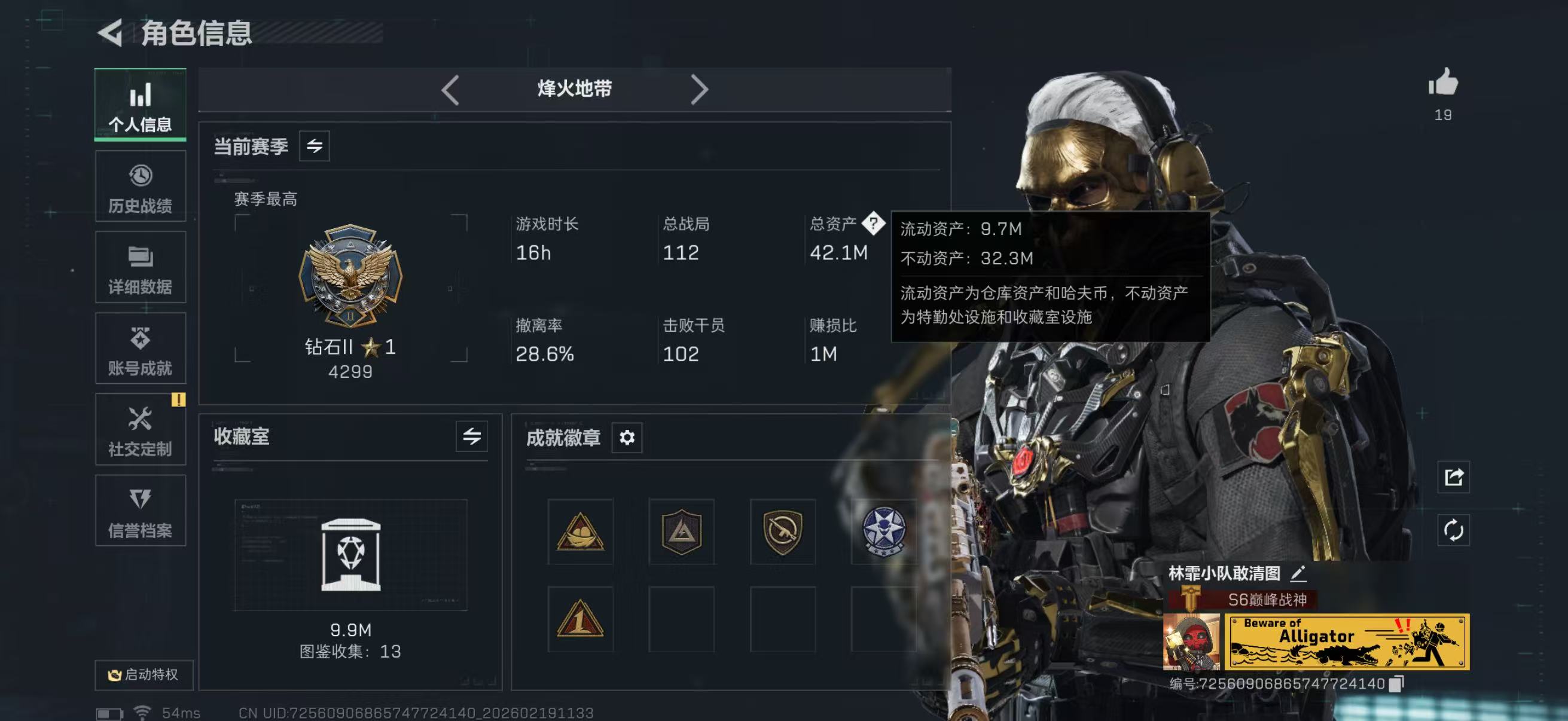 总资产(M):258M/哈夫币(K):3590K/传说枪皮数:25/全面战场等级:42_段位:军士长/烽火地带等级:60_段位:钻石/