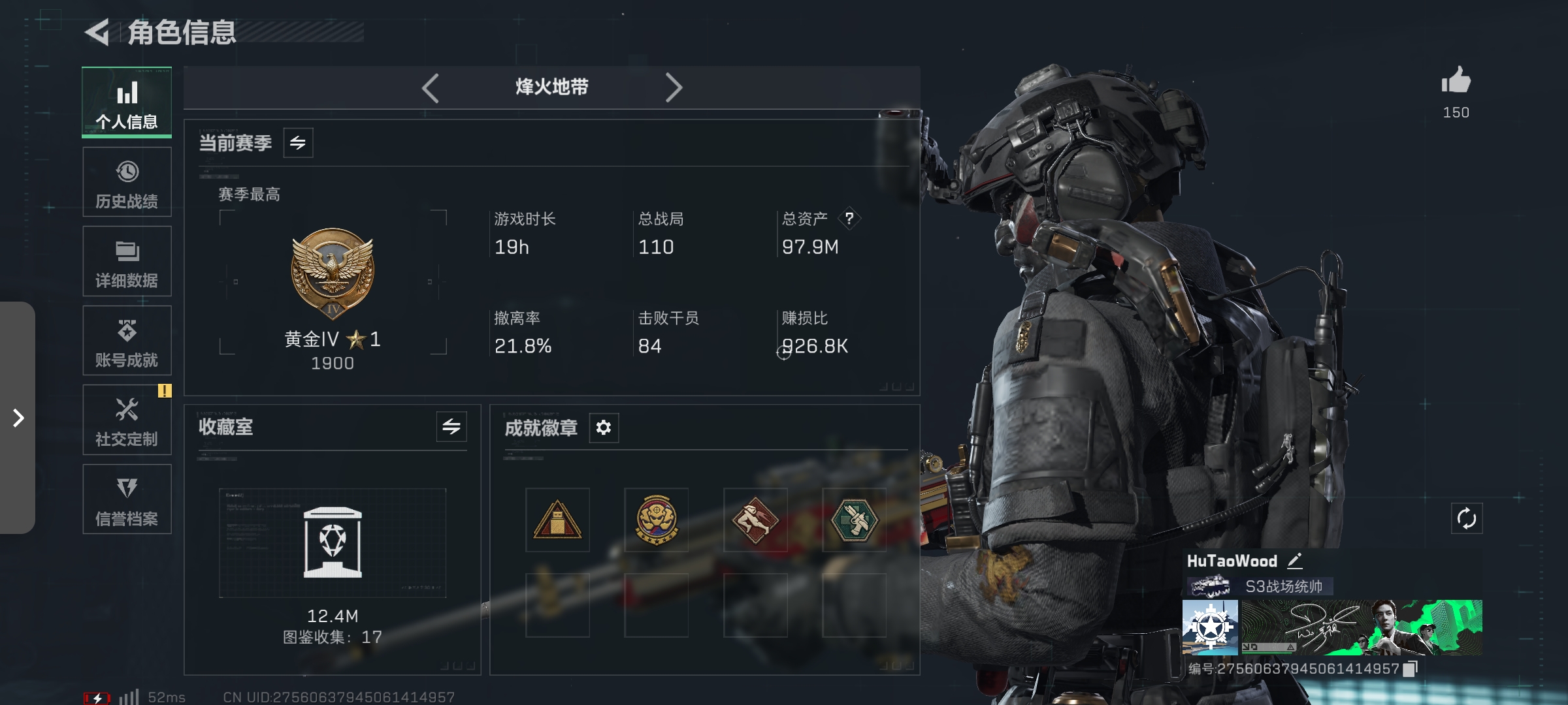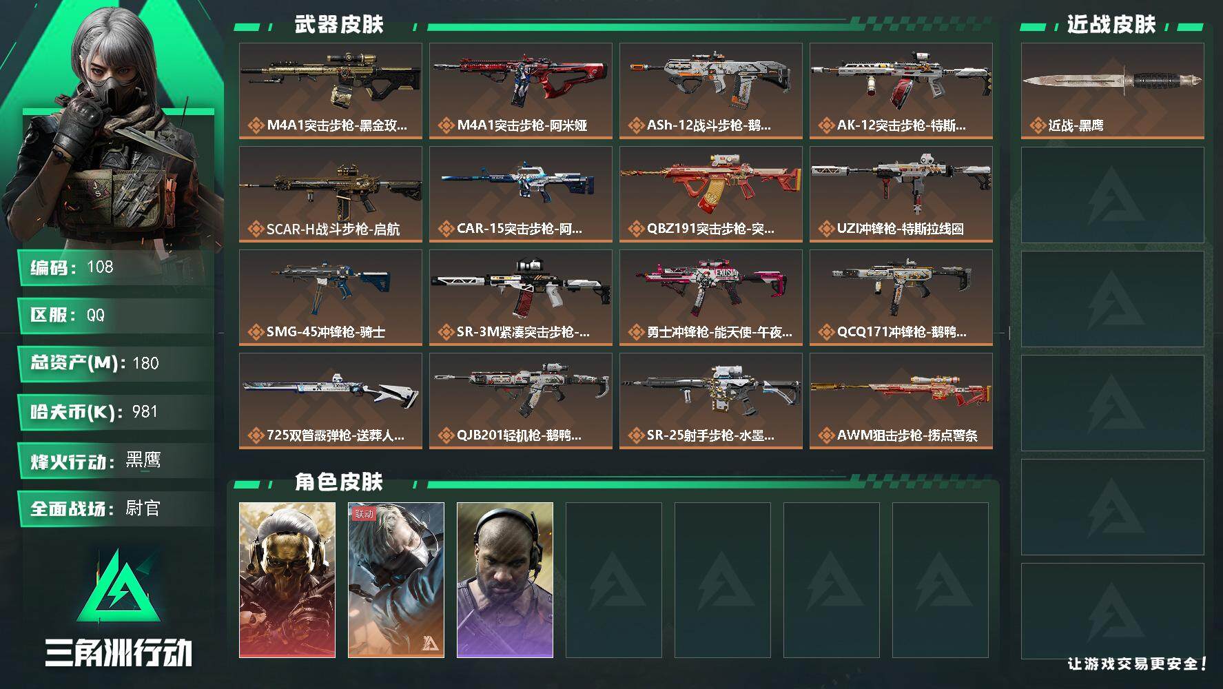 180m总资产-981k哈伏币-60烽火等级-黑鹰-36战场等级-尉官 ME1