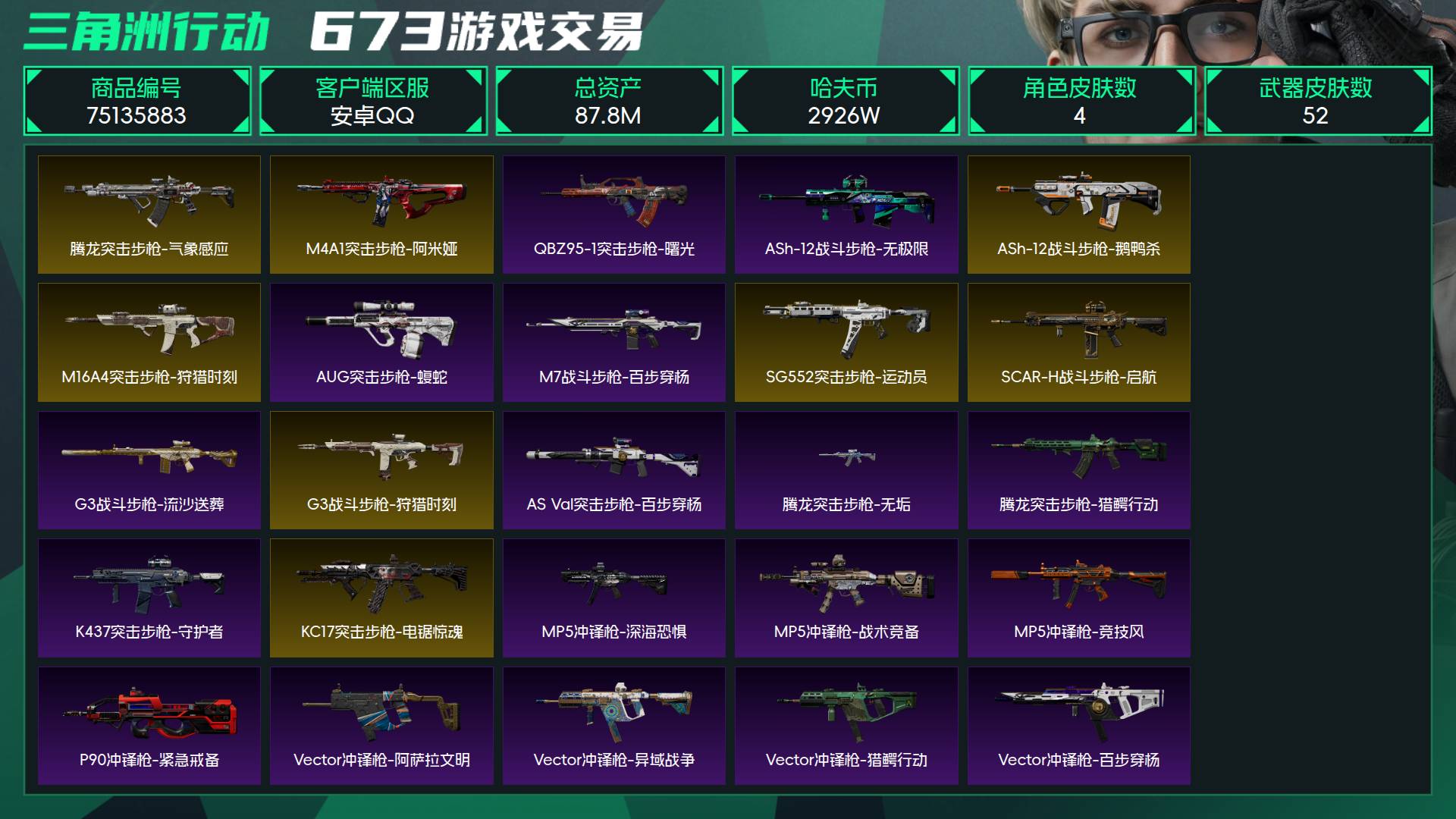 367m仓库 181m纯币 满体满负 3x3保险 70发AP 34m收藏室 仓库多红和装备 可二次