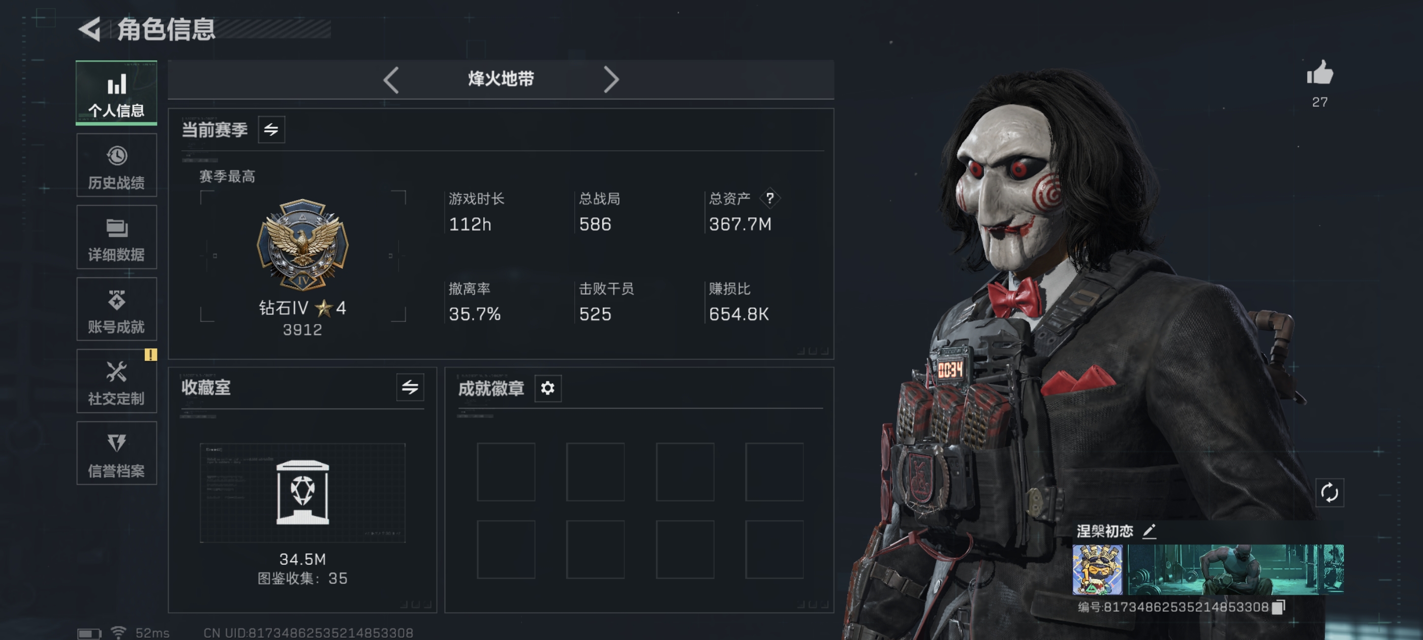 烽火段位黑鹰2 战场段位暂无段位 总资产87.8M 哈夫币2926W 干员4 挂饰17 近战1 枪械52 载具37