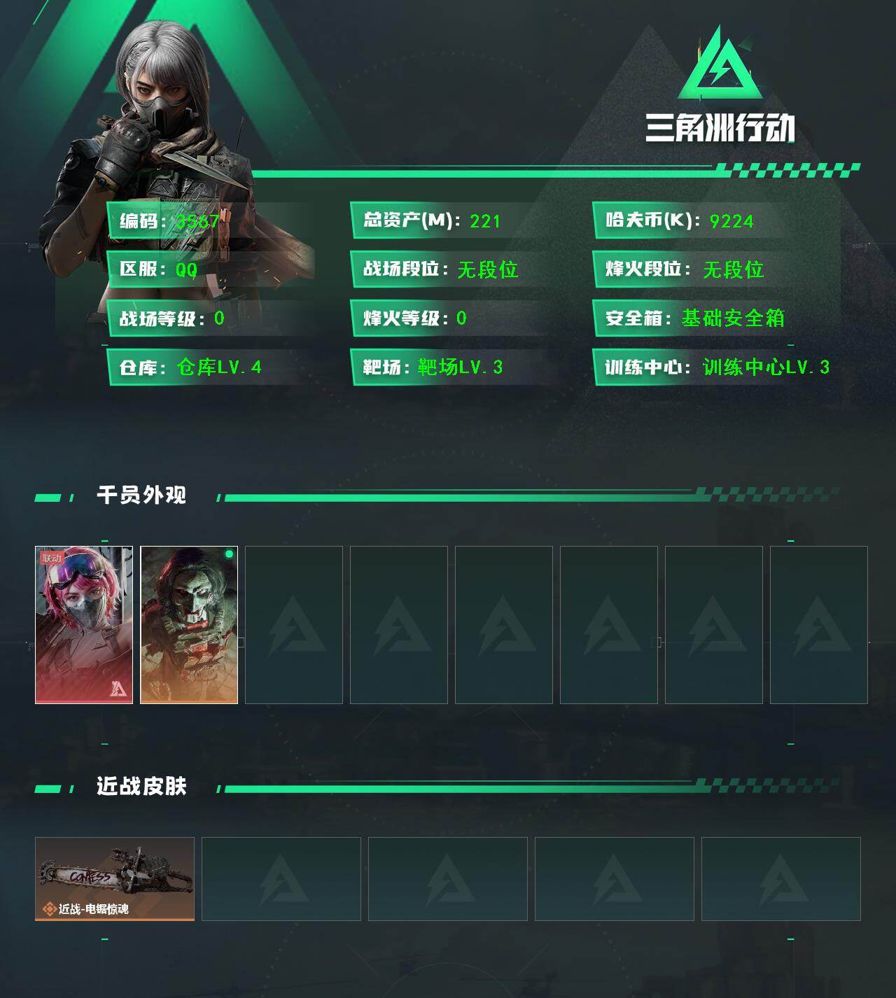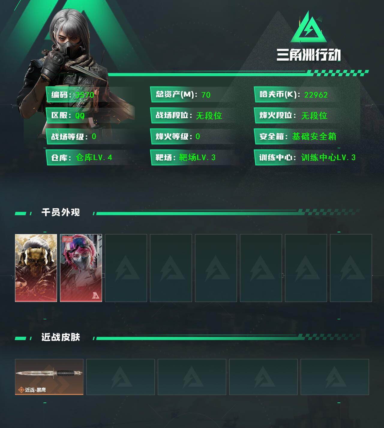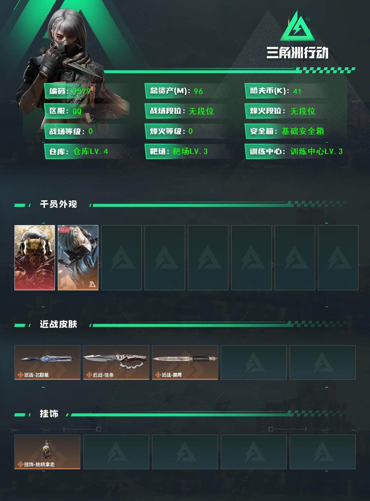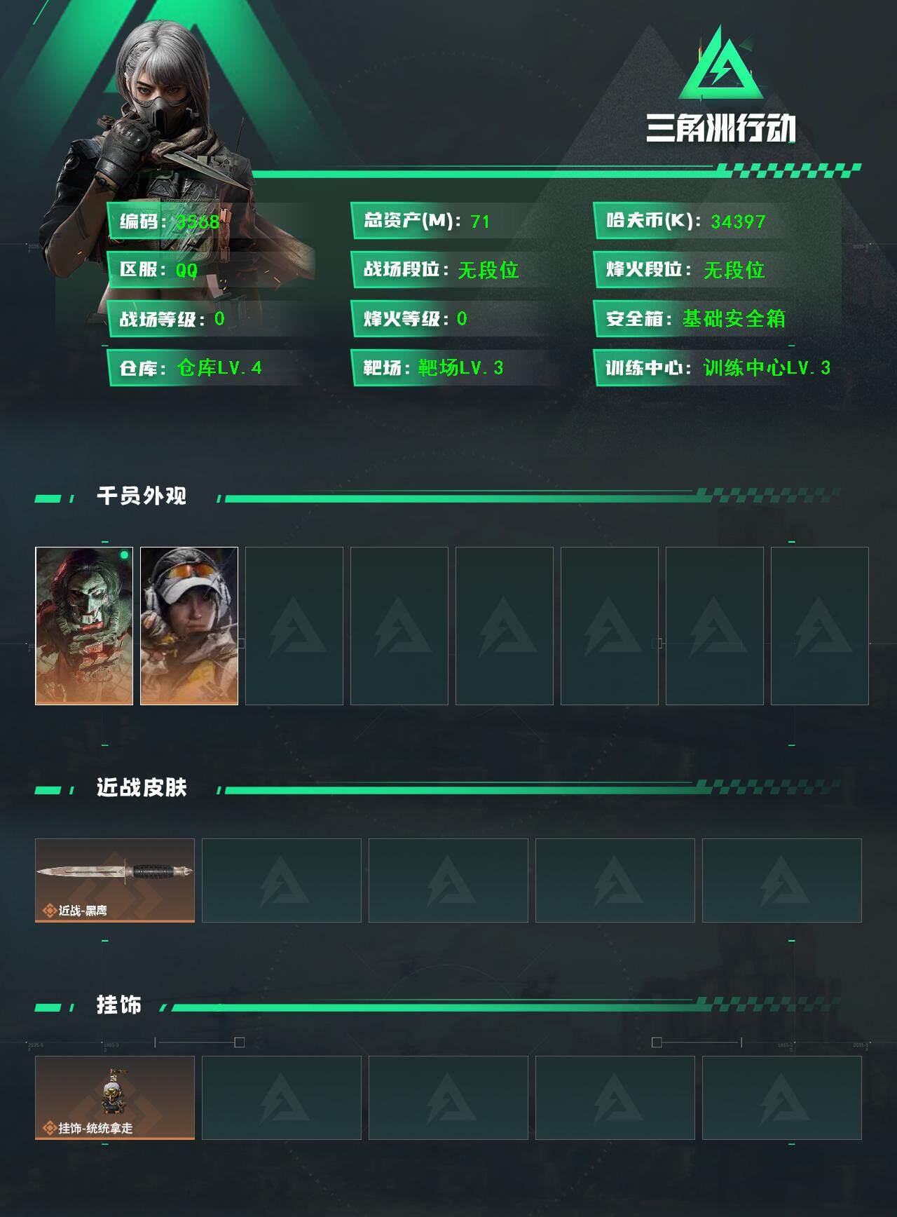 烽火段位钻石4 战场段位上等兵1 总资产41.6M 哈夫币46W 干员3 挂饰16 近战1 枪械51 载具11