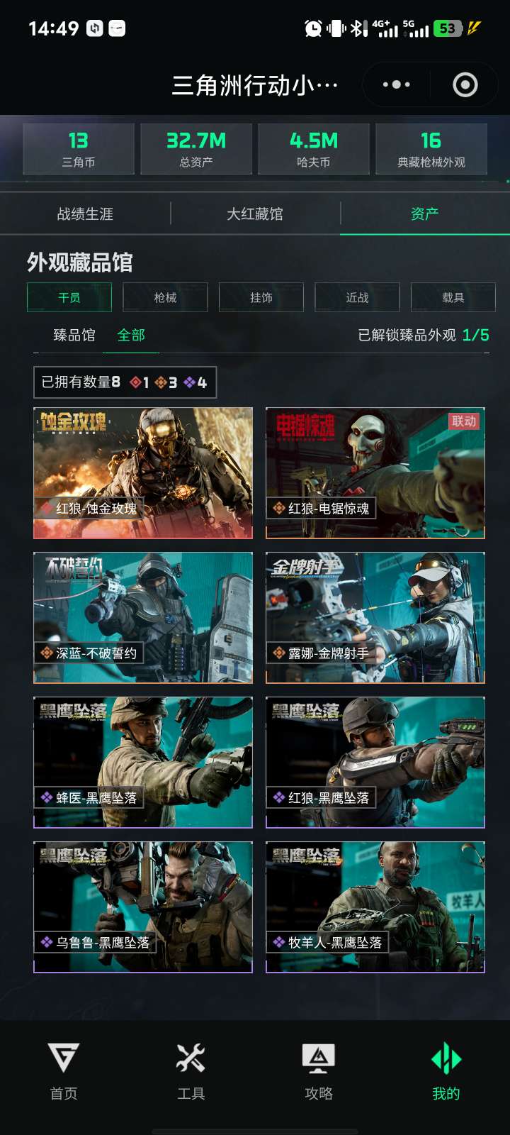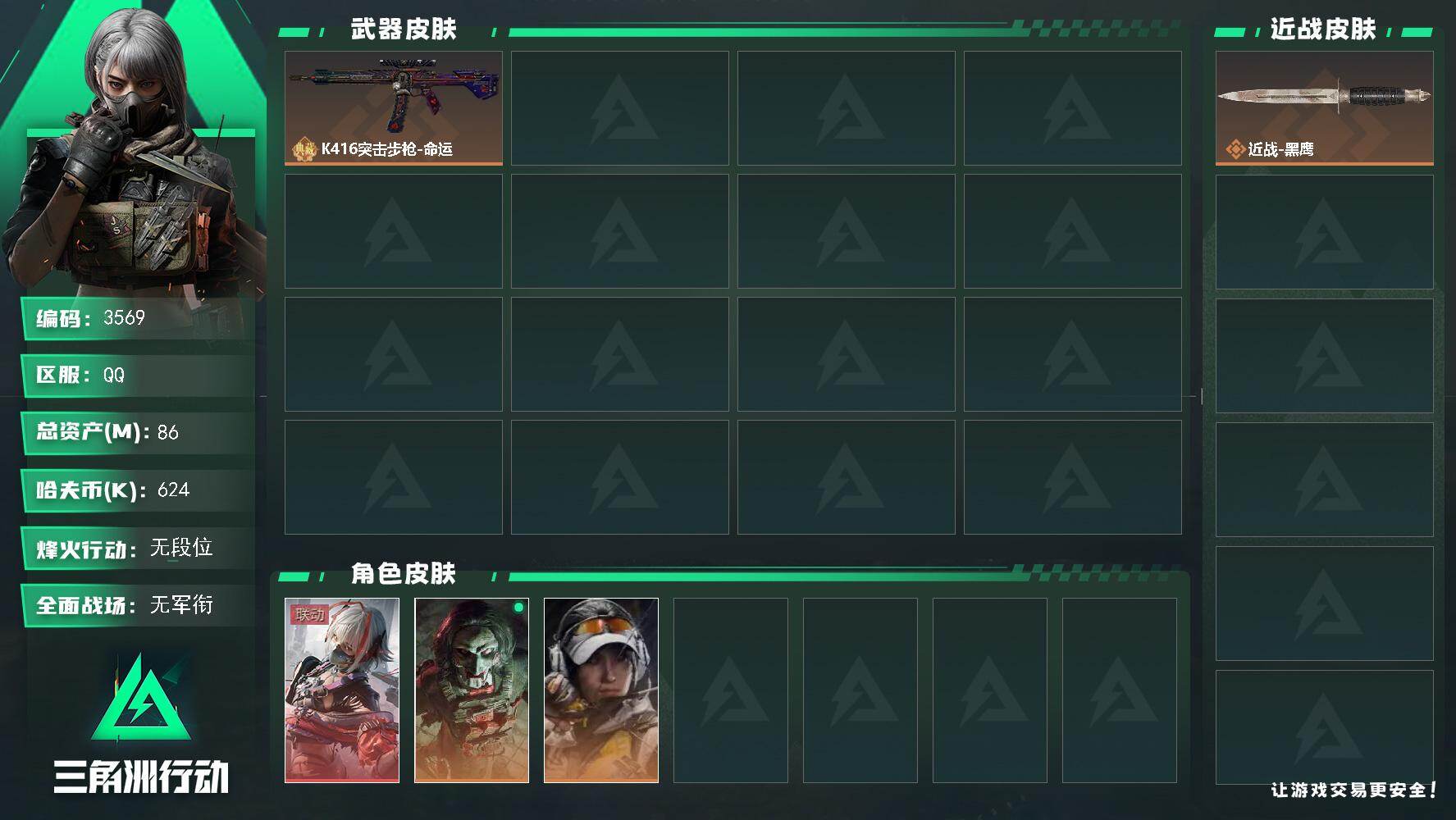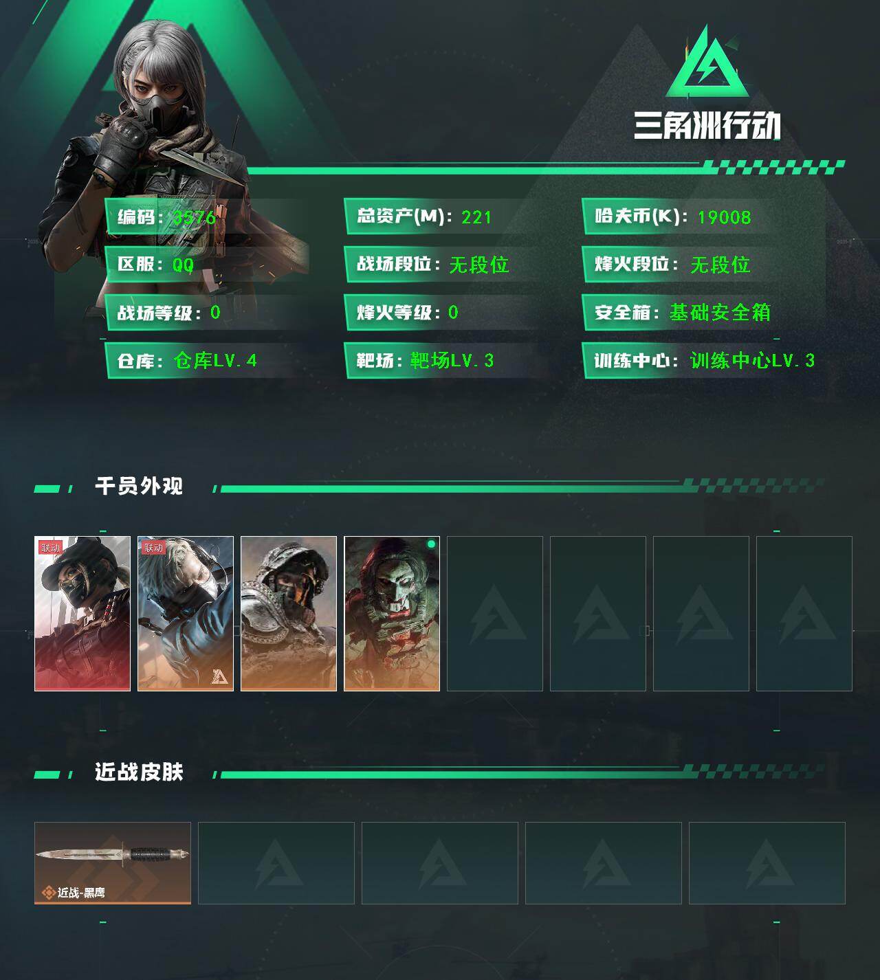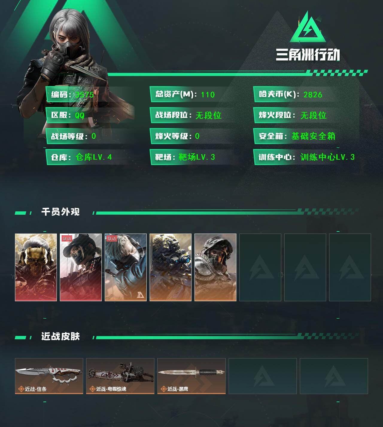 烽火段位钻石4 战场段位上等兵1 总资产41.6M 哈夫币46W 干员3 挂饰16 近战1 枪械51 载具11