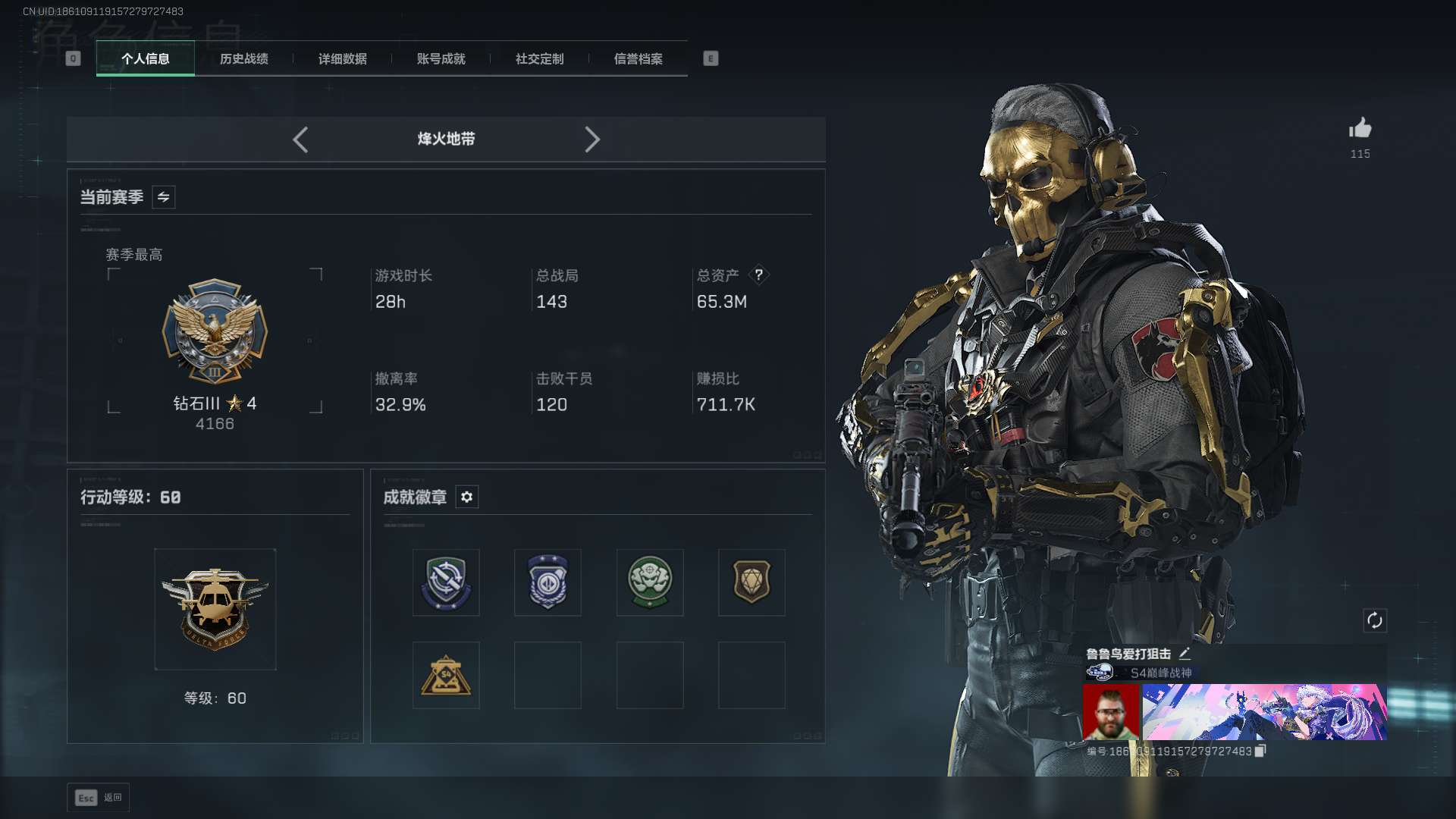 总资产(M):65M/哈夫币(K):651K/全面战场等级:35_段位:上等兵/烽火地带等级:60_段位:黑鹰/