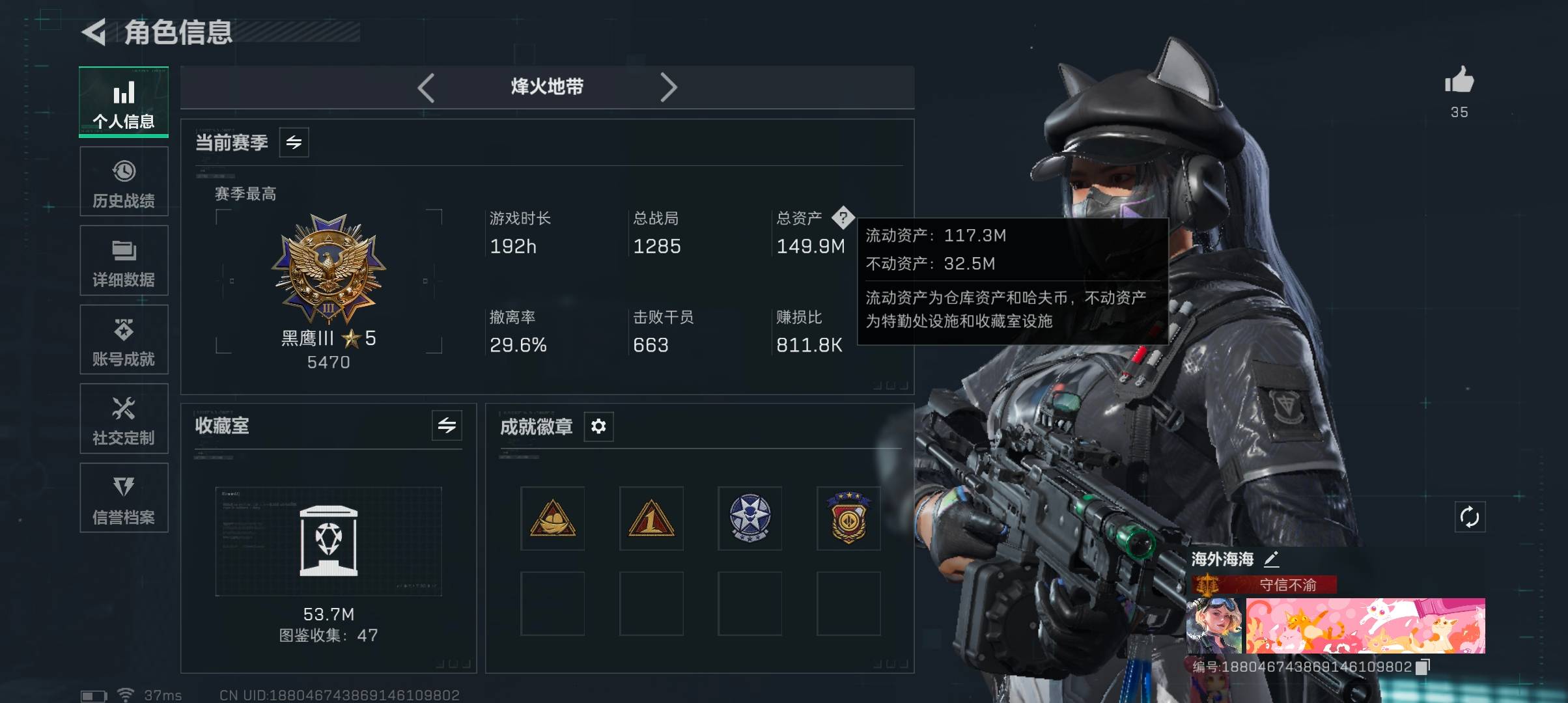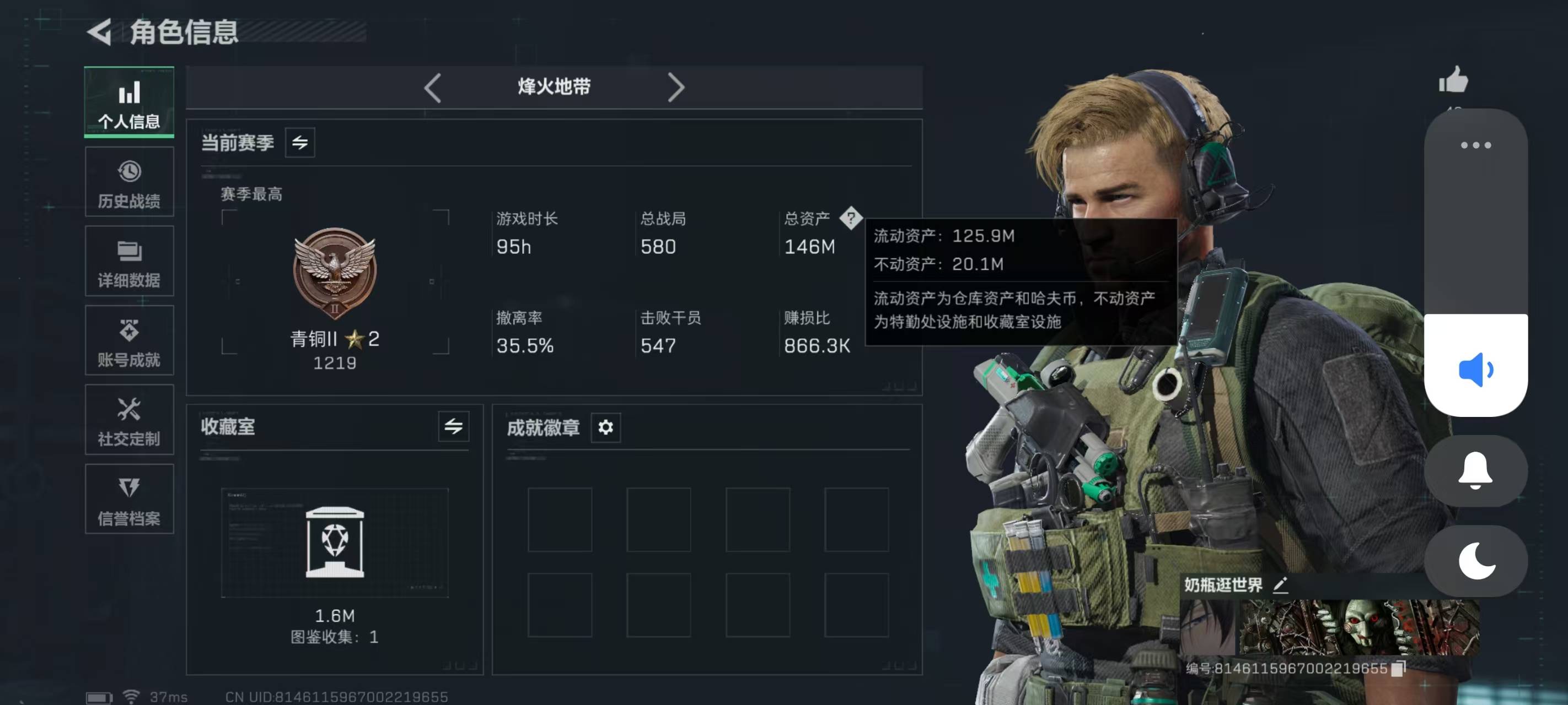 总资产146m 流动资产125.9m 哈夫币7185k 1红皮 1金皮 高级安全箱 仓库lv7 指挥