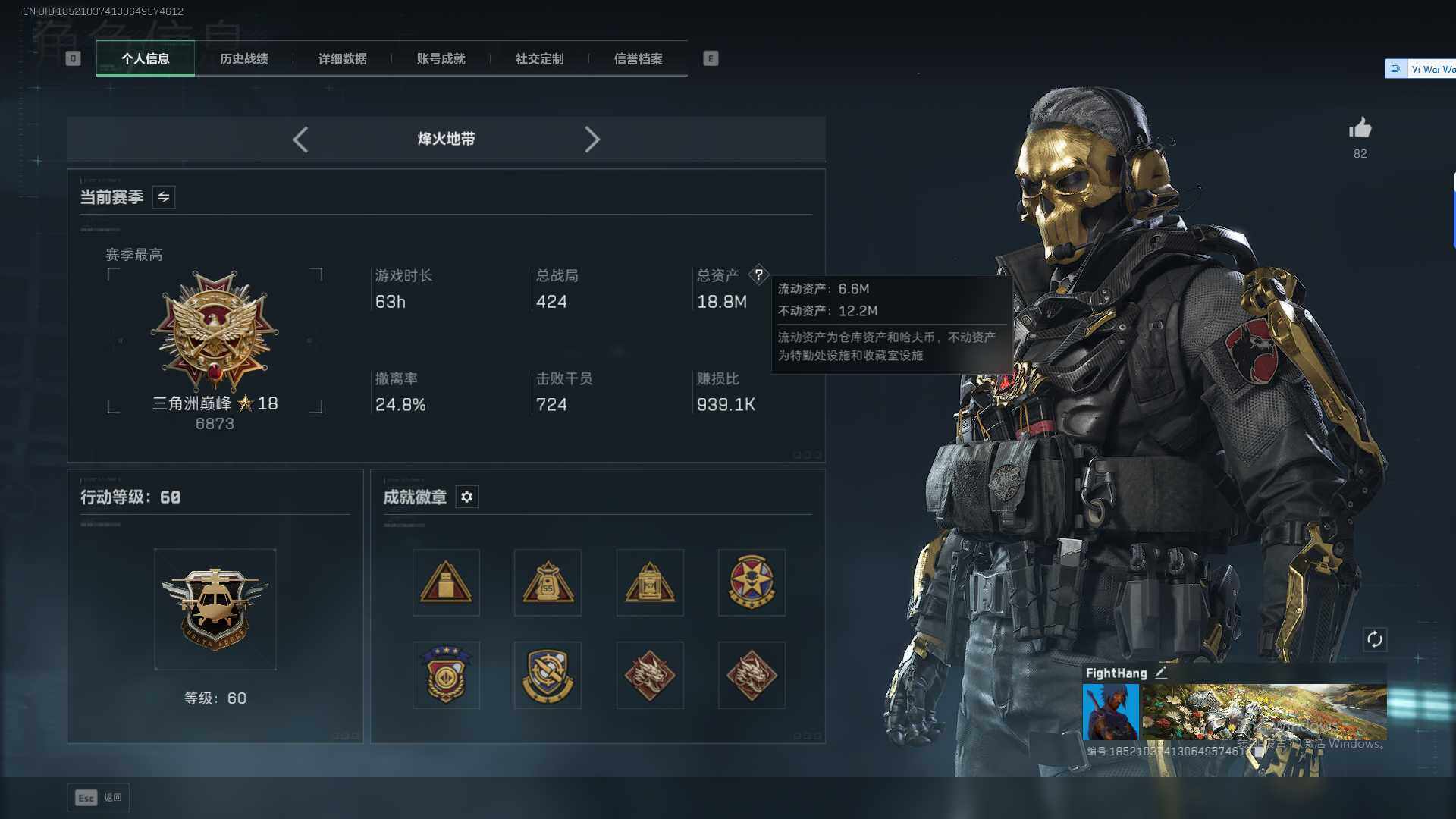 总资产134.84M,哈夫币 47.22K,战场等级:18 列兵,行动等级:60 铂金,角色皮肤7,