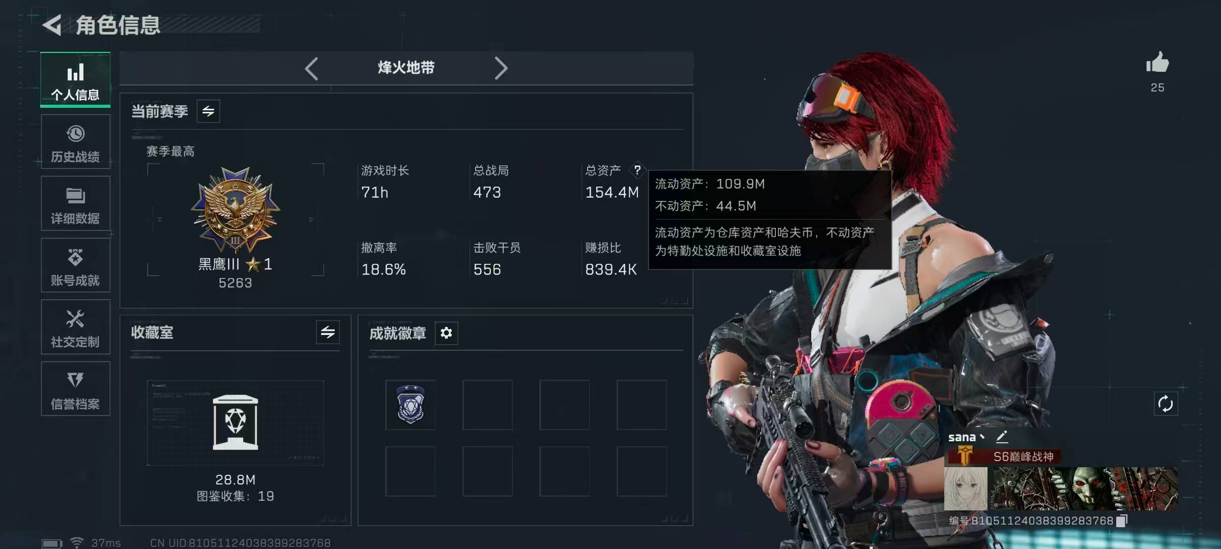 总资产154.4m 流动资产109m 哈夫币12514k 2红皮 1刀 顶级安全箱 仓库lv9 训练