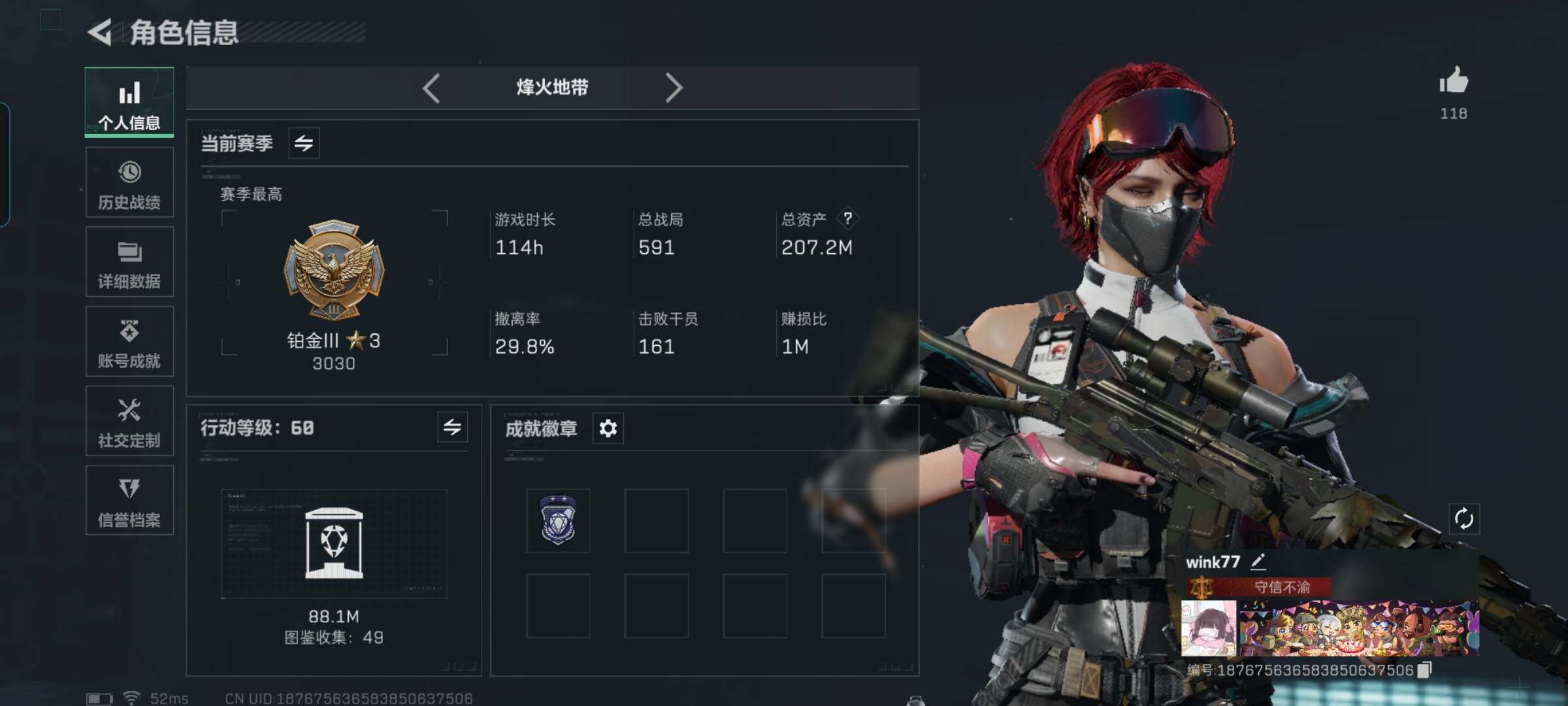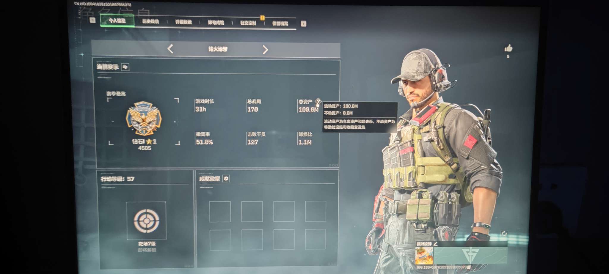 总资产(M):236M/哈夫币(K):380K/全面战场等级:50_段位:将军/烽火地带等级:60_段位:钻石