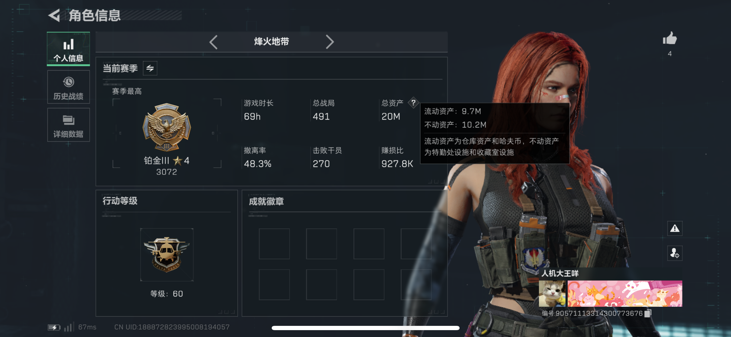 总资产(M):48M/哈夫币(K):2K/哈夫币(K):2K/全面战场等级:24_段位:列兵/烽火地