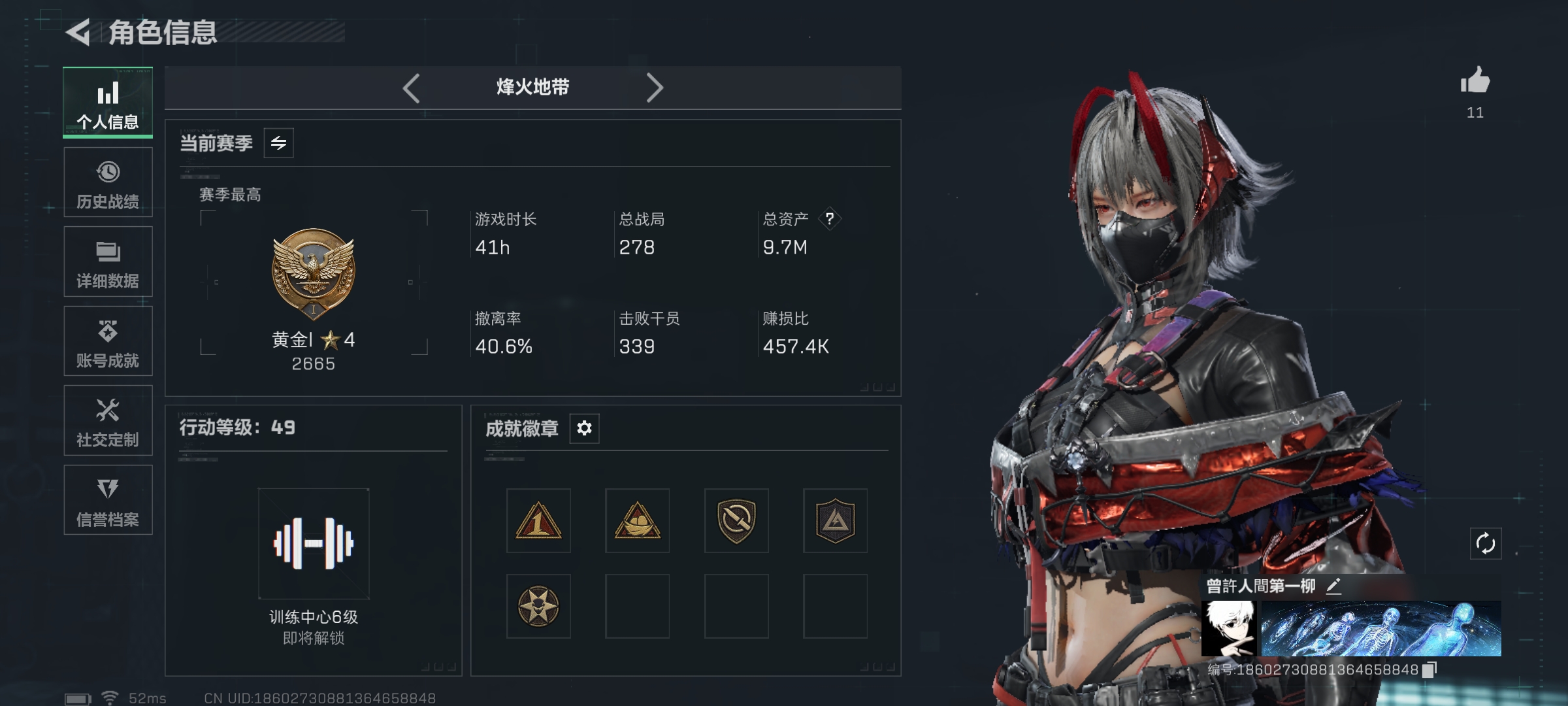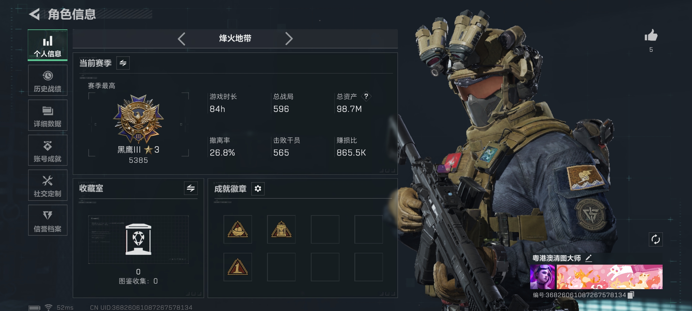 总资产(M):65M/哈夫币(K):651K/全面战场等级:35_段位:上等兵/烽火地带等级:60_段位:黑鹰/