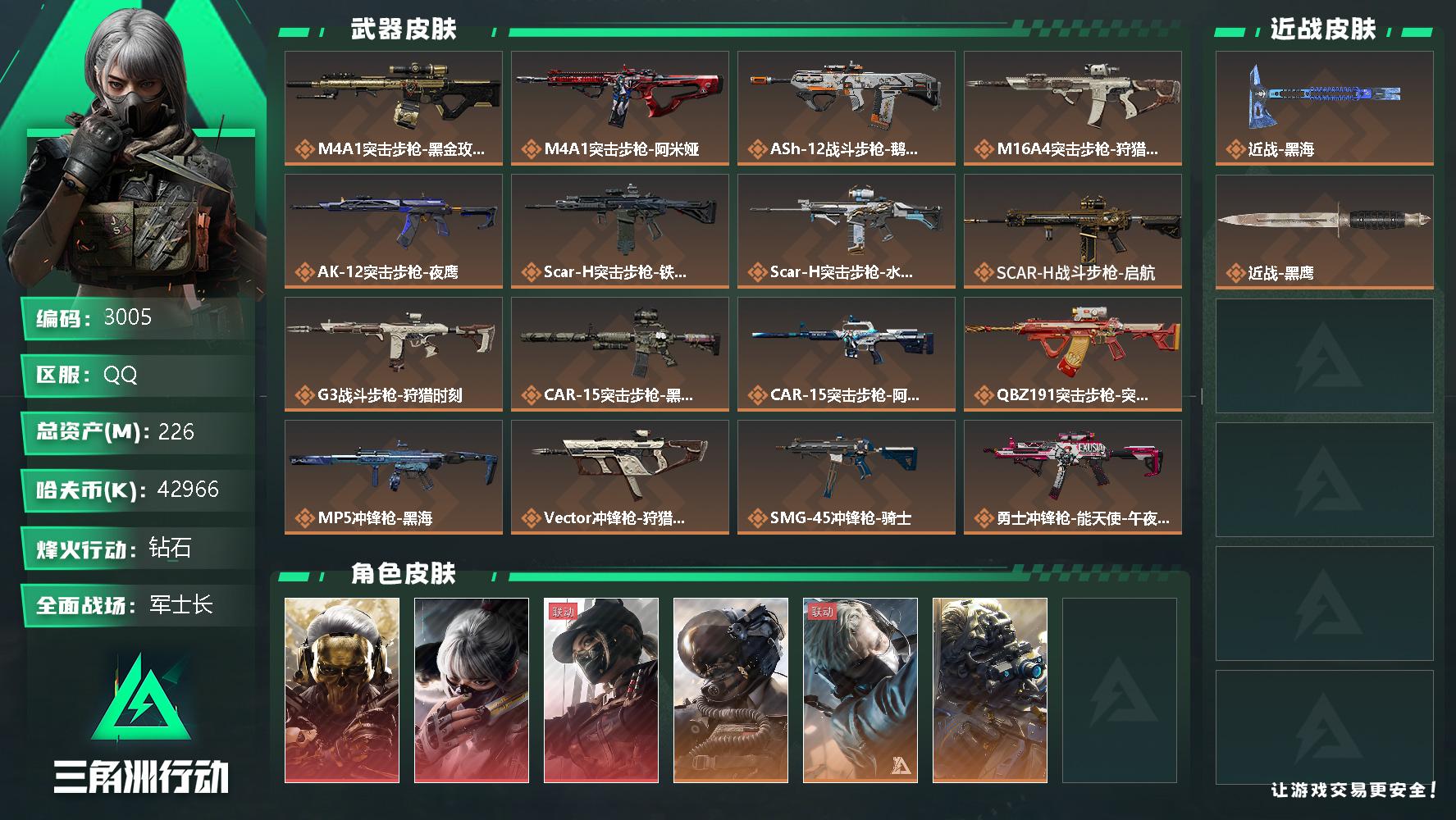 总资产(M):213M/哈夫币(K):46K/哈夫币(K):46K/全面战场等级:43_段位:军士长