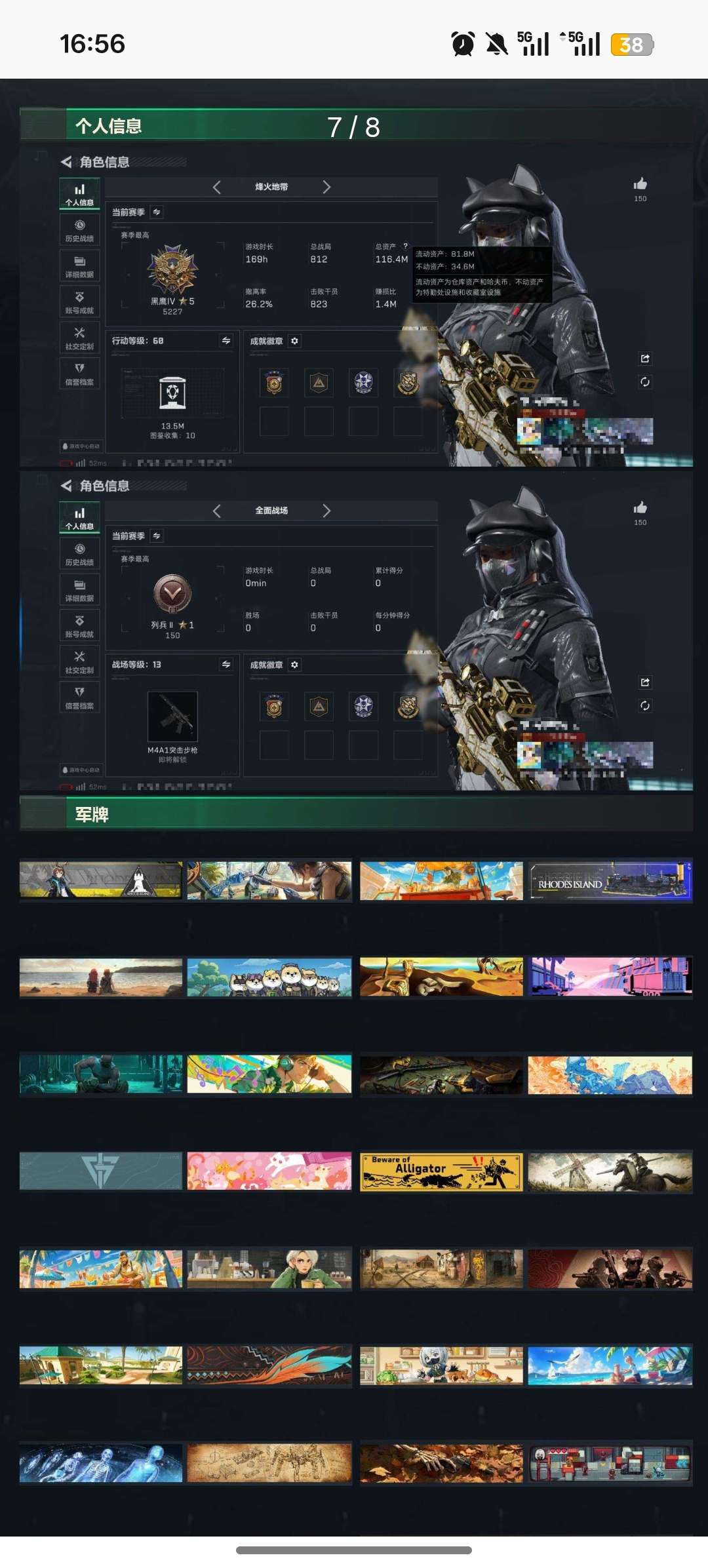 总资产(M):35M/哈夫币(K):1K/传说枪皮数:13/全面战场等级:5_段位:无段位/烽火地带等级:60_段位:黑鹰/