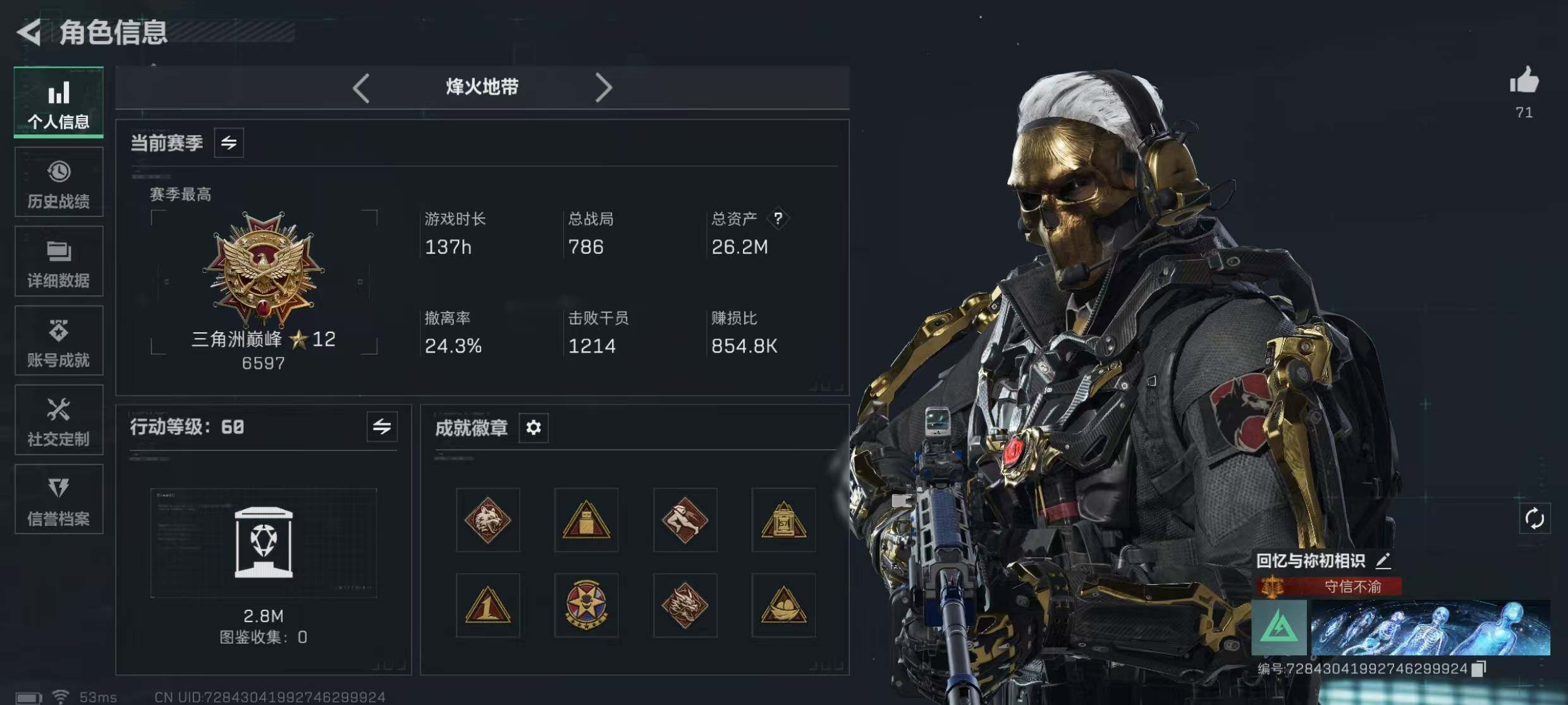 总资产(M):71M/哈夫币(K):405K/传说枪皮数:10/全面战场等级:22_段位:上等兵/烽火地带等级:60_段位:黄金