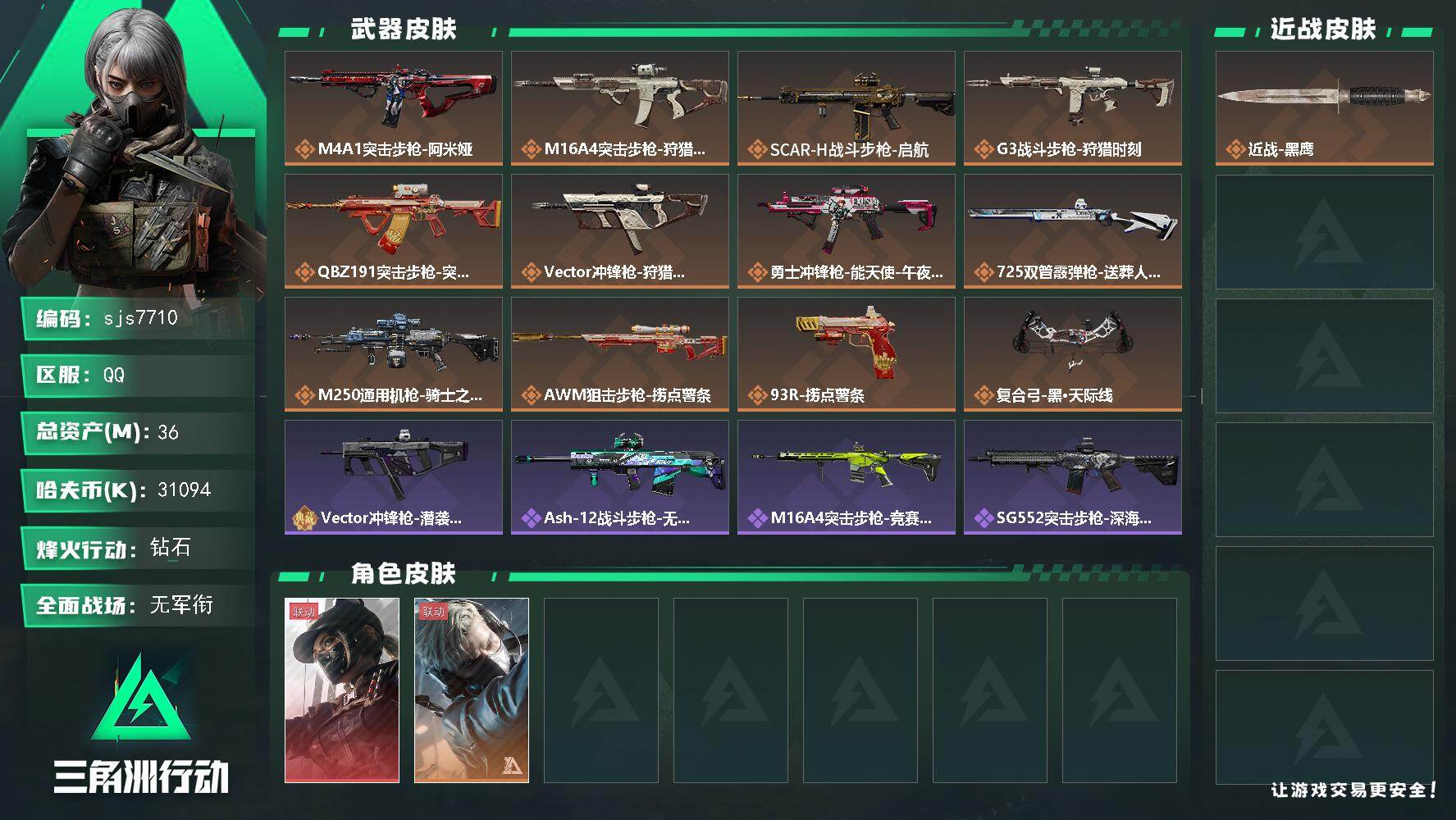 总资产35m 露娜 烽火地带段位: 钻石 全面战场段位: 无段位 总资产: 36000000 哈夫币: 31094000