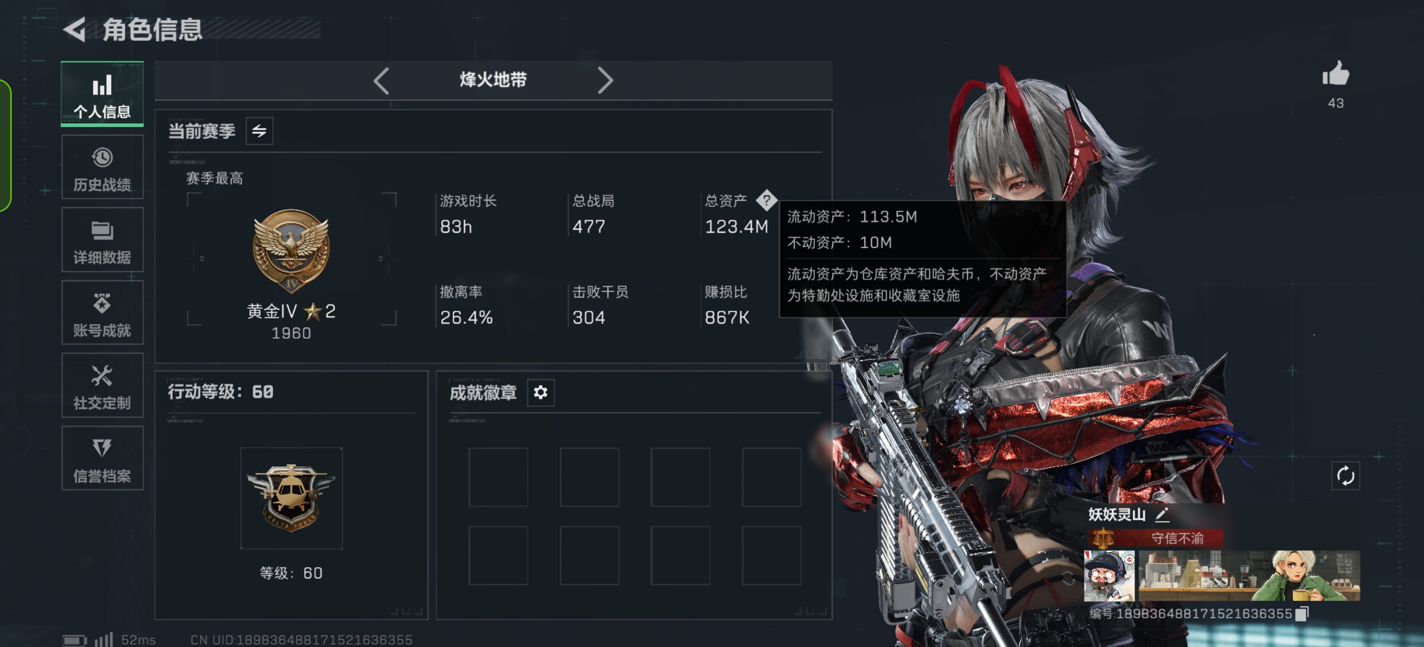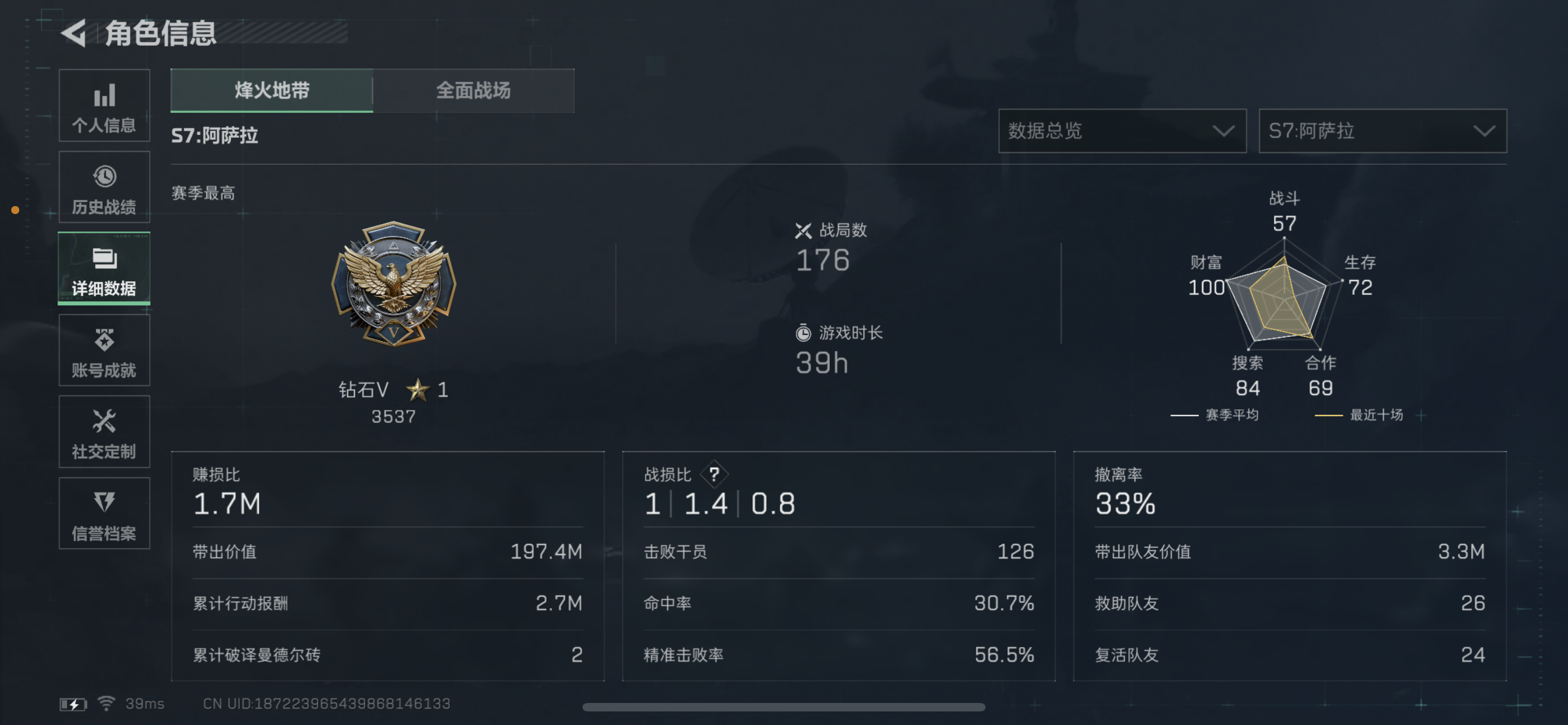 57.8m总资产 蚀金玫瑰+天际线=北极星 烽火地带段位: 钻石
