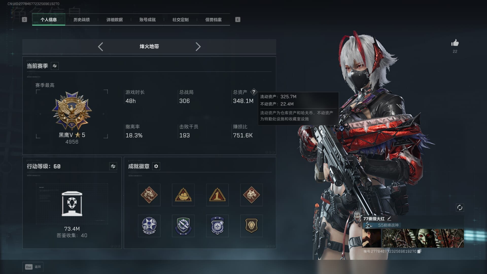 60级账号纯币1.07亿/287M总资产/体负双6【个人信息】战场等级:37