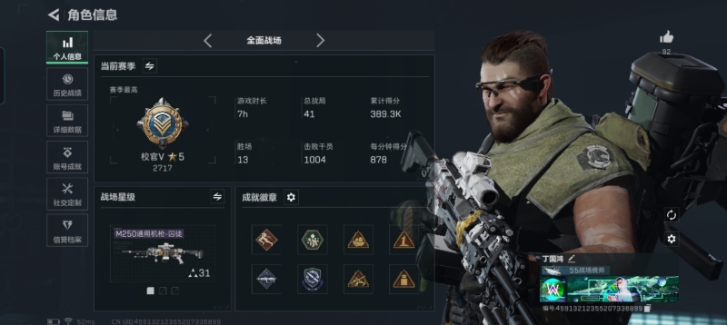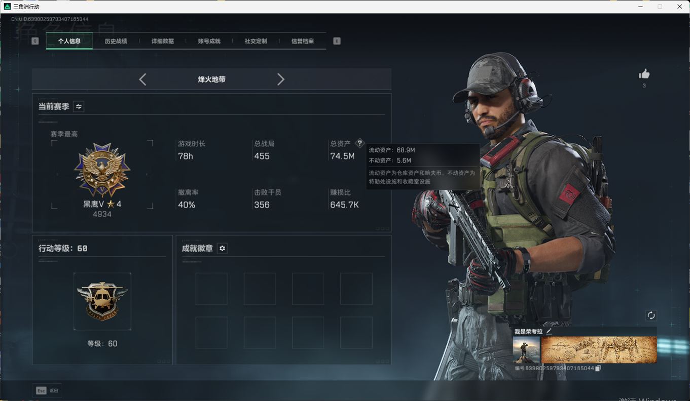 N6399/QQ区/【个人信息】战场等级1军士长/行动等级60黑鹰【哈夫币】1373w【总资产】74