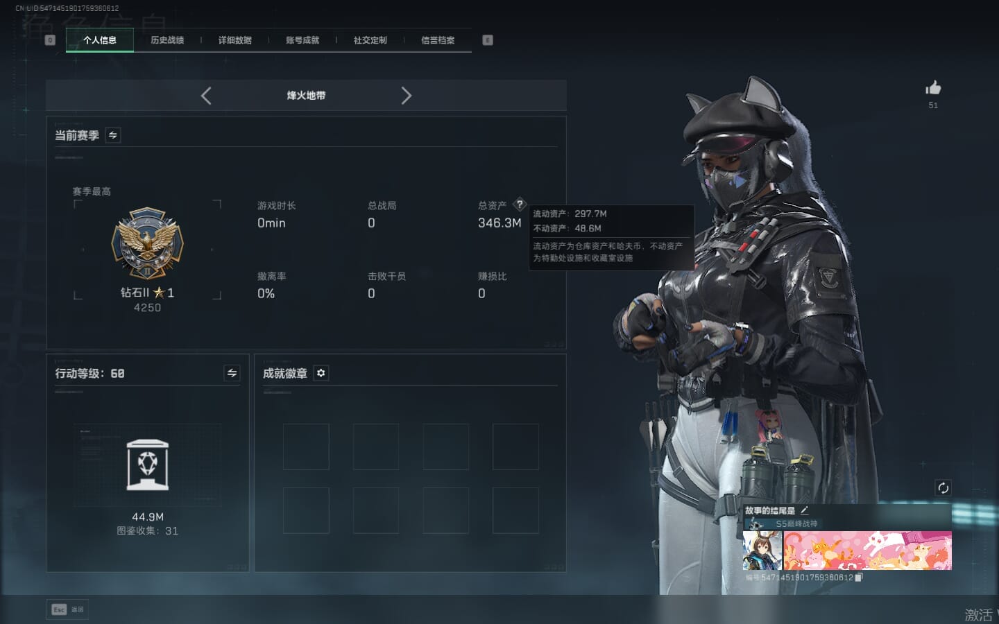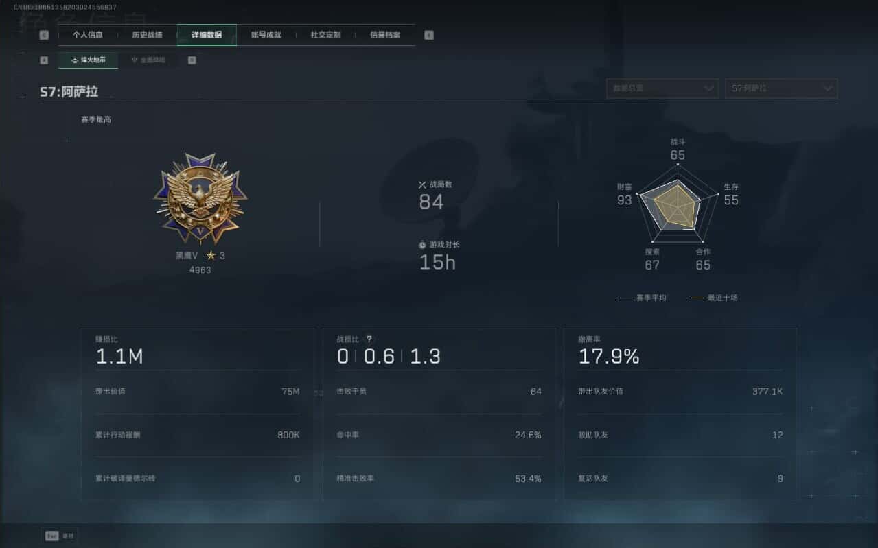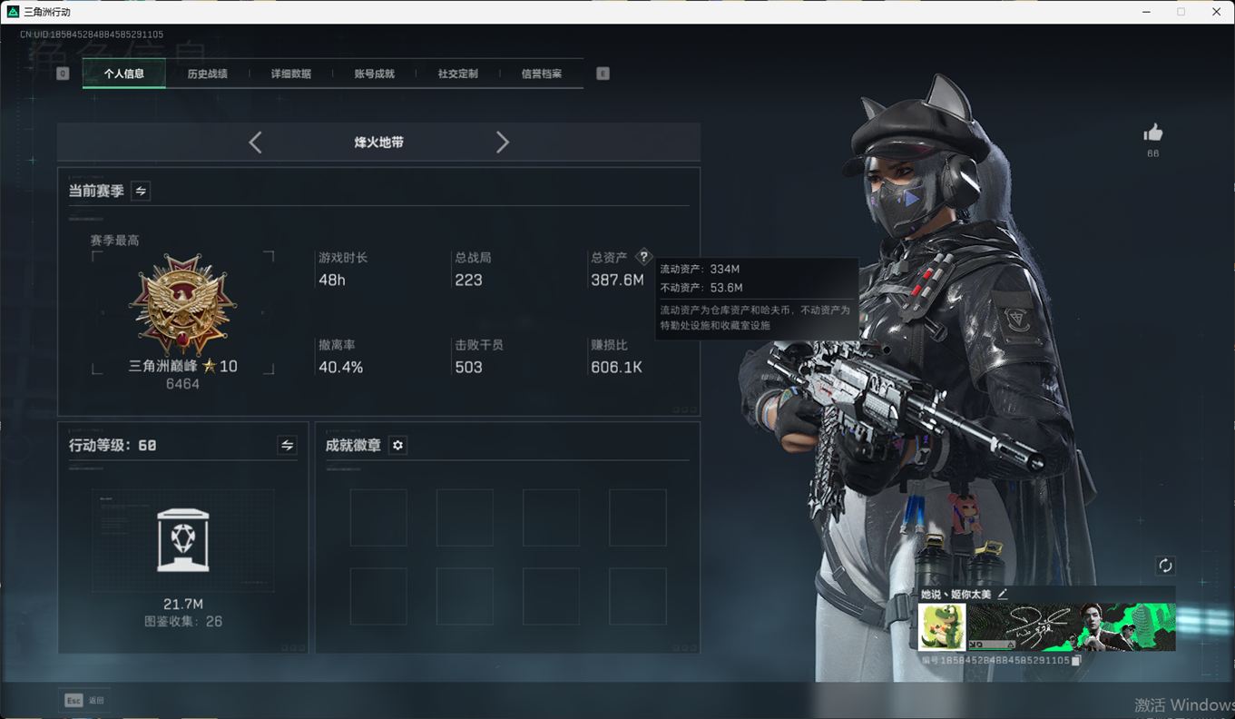 N6406/QQ区/【个人信息】战场等级1军士长/行动等级60铂金【哈夫币】9063w【总资产】62