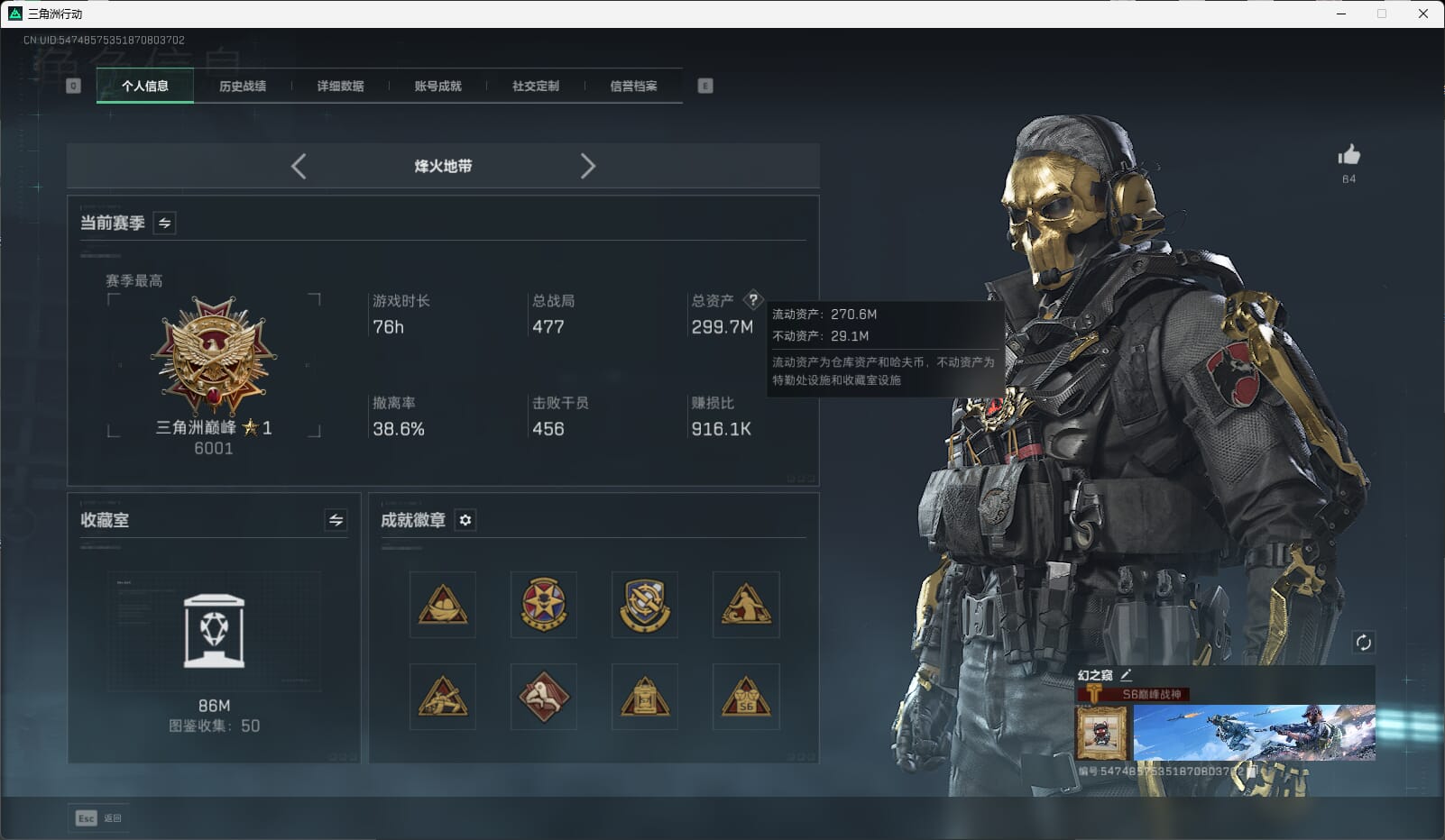H8938/QQ/【猛攻资产号】/总资产299.7M/流动资产270.6M/哈夫币1.1亿/行动等级