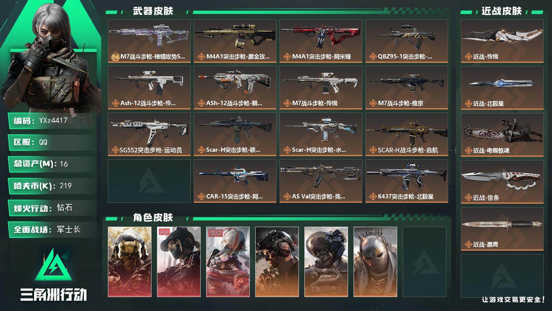H8817/QQ/哈夫币63W/总资产105.7M/行动等级60/战场等级32/【近战】/信条/黑鹰