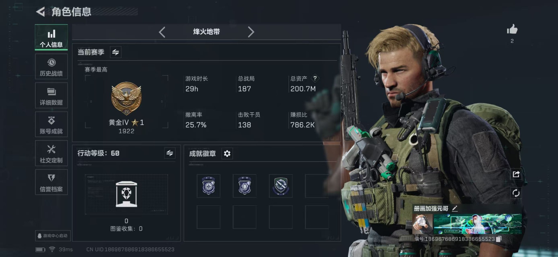 总资产:200.7M 3干员外观 16传说枪械 哈夫币:95.168K 可二次 可修改实名