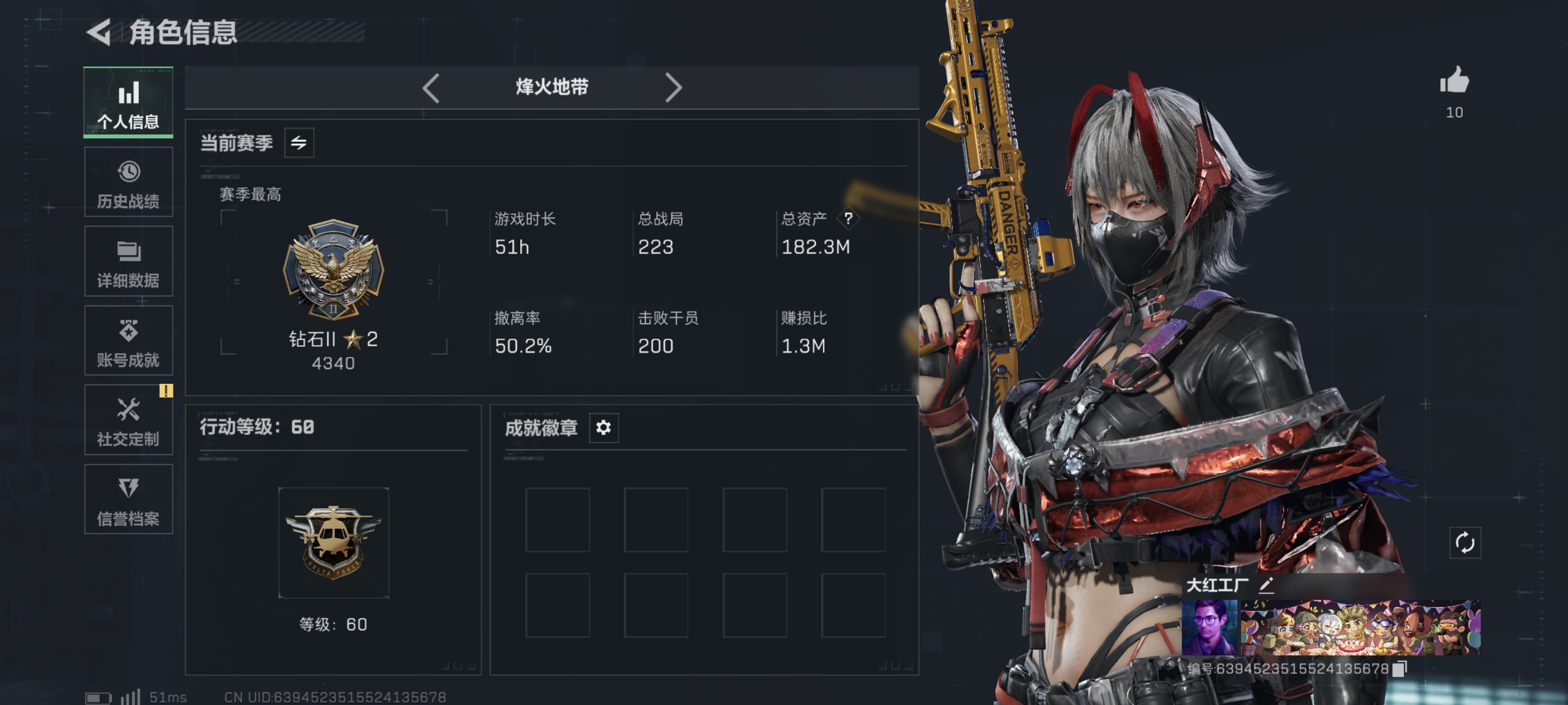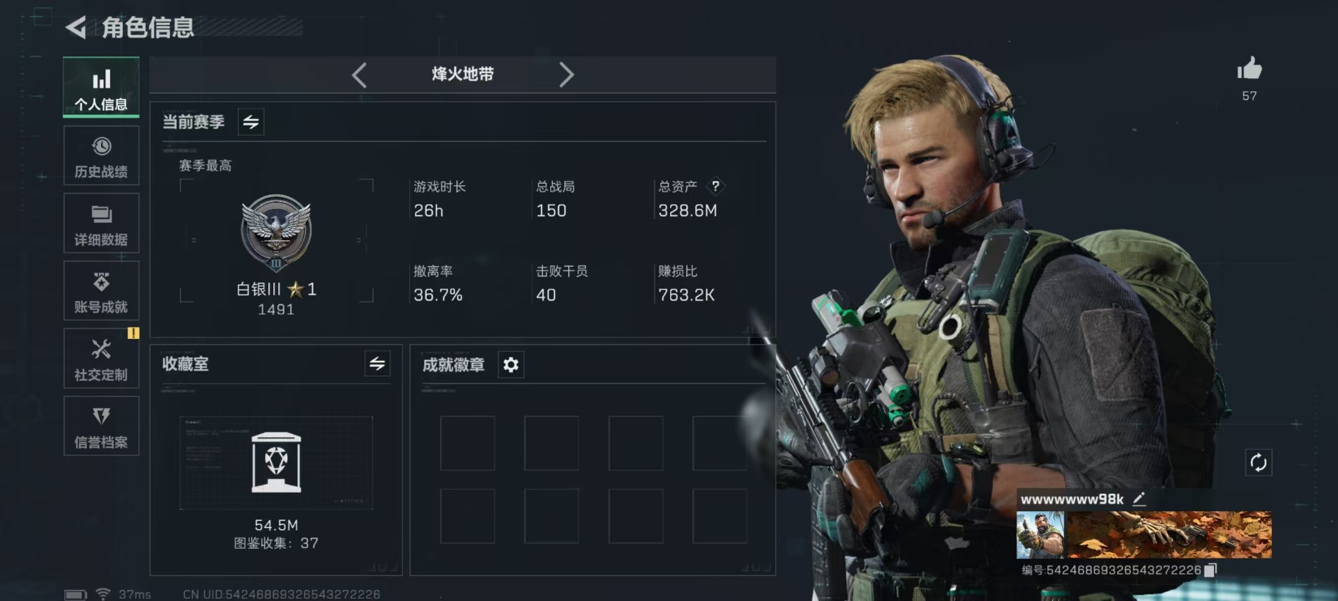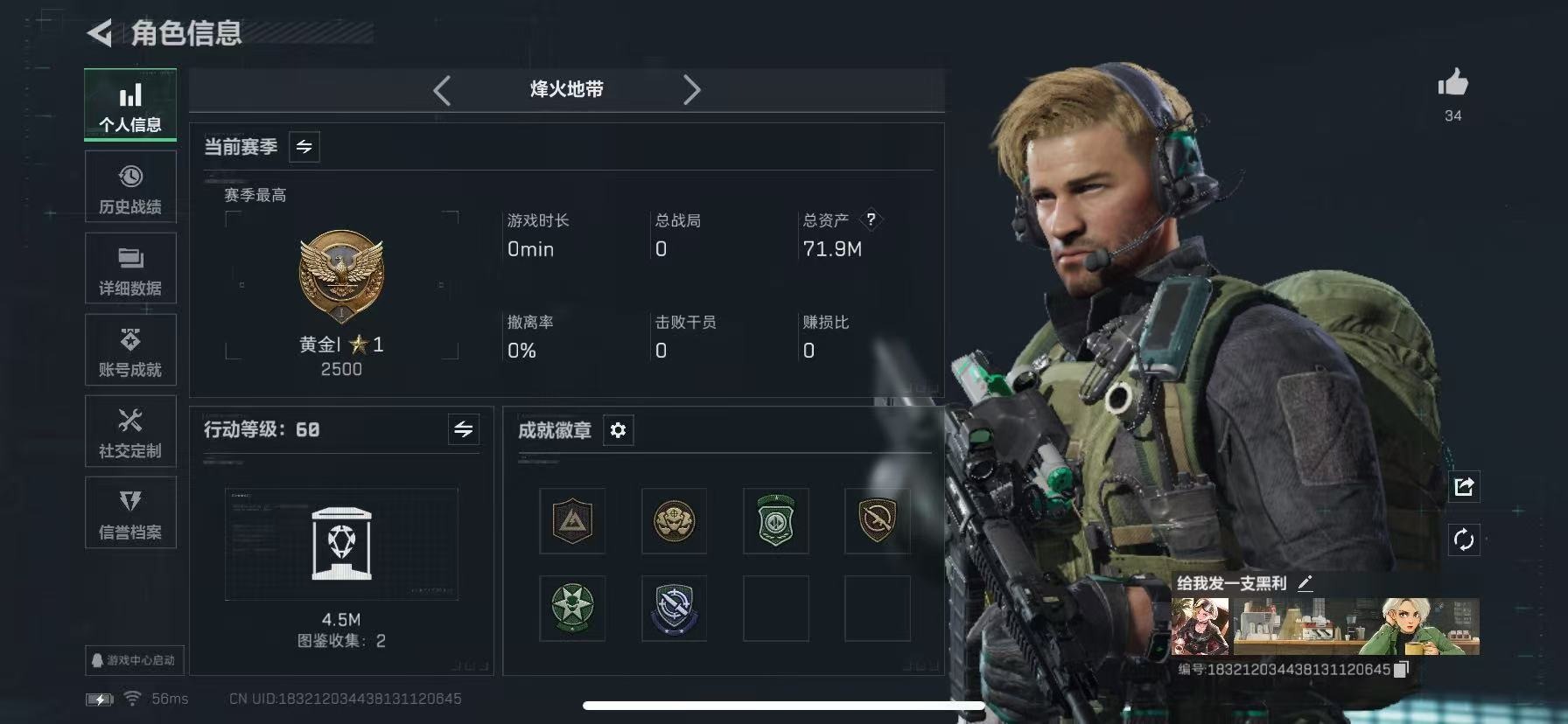总资产:341.3M 1干员外观 12传说枪械 哈夫币:3.184K 可二次 可修改实名