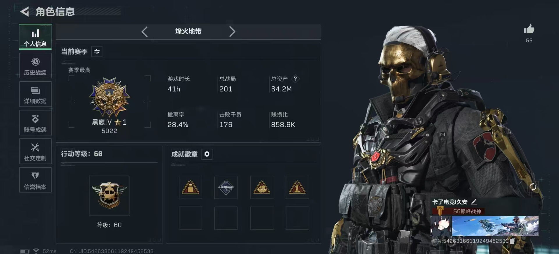 总资产:64.2M 3干员外观 18传说枪械 哈夫币:4.453K 可二次 可修改实名