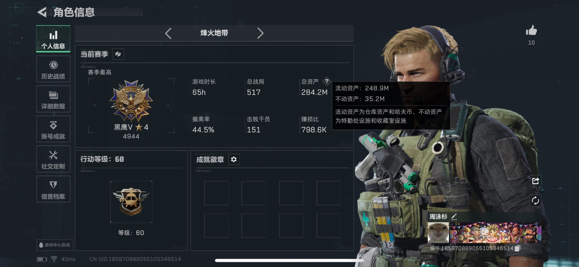 总资产:284.2M 2干员外观 8传说枪械 哈夫币:243K 可二次 可修改实名
