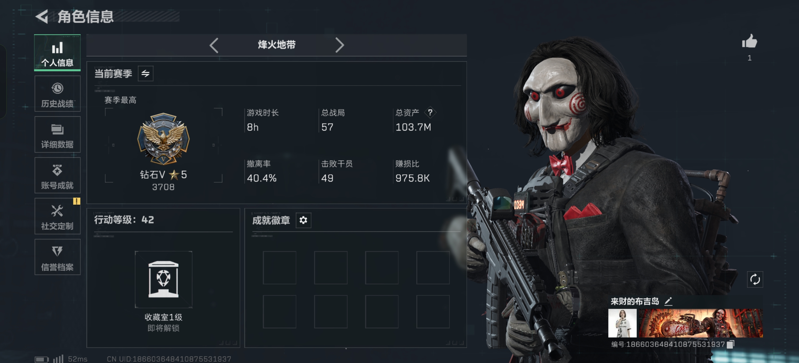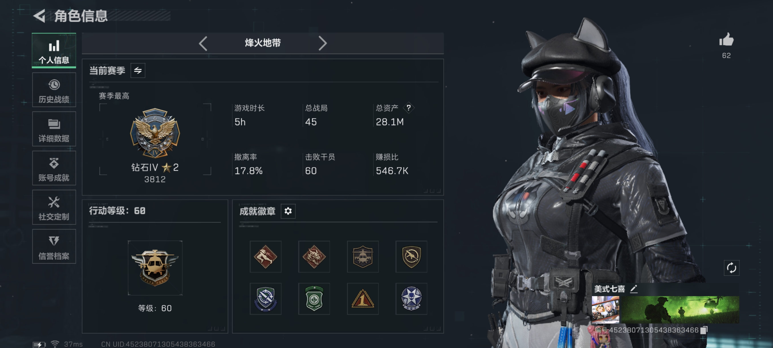 H9299/区服QQ/哈夫币1250万/总资产203M/行动等级60/战场等级31/【特战干员】/红