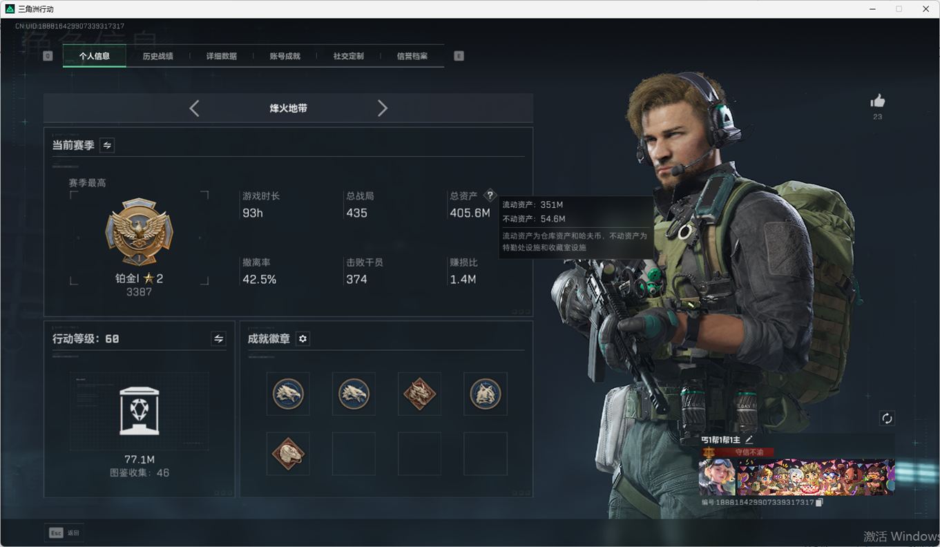 N6395/QQ区/战场等级16列兵/行动等级60铂金【哈夫币】9542.1w【总资产】405M