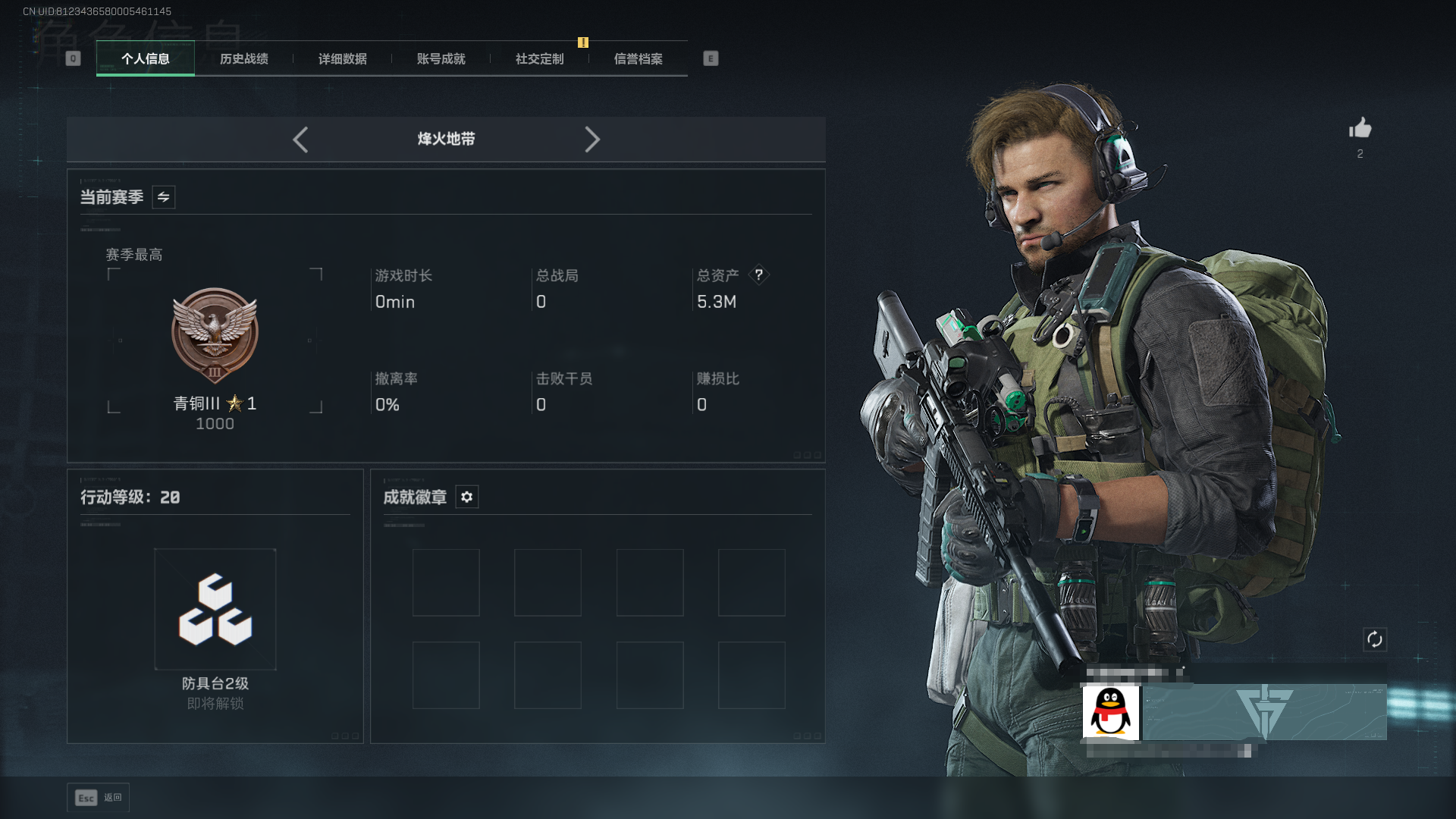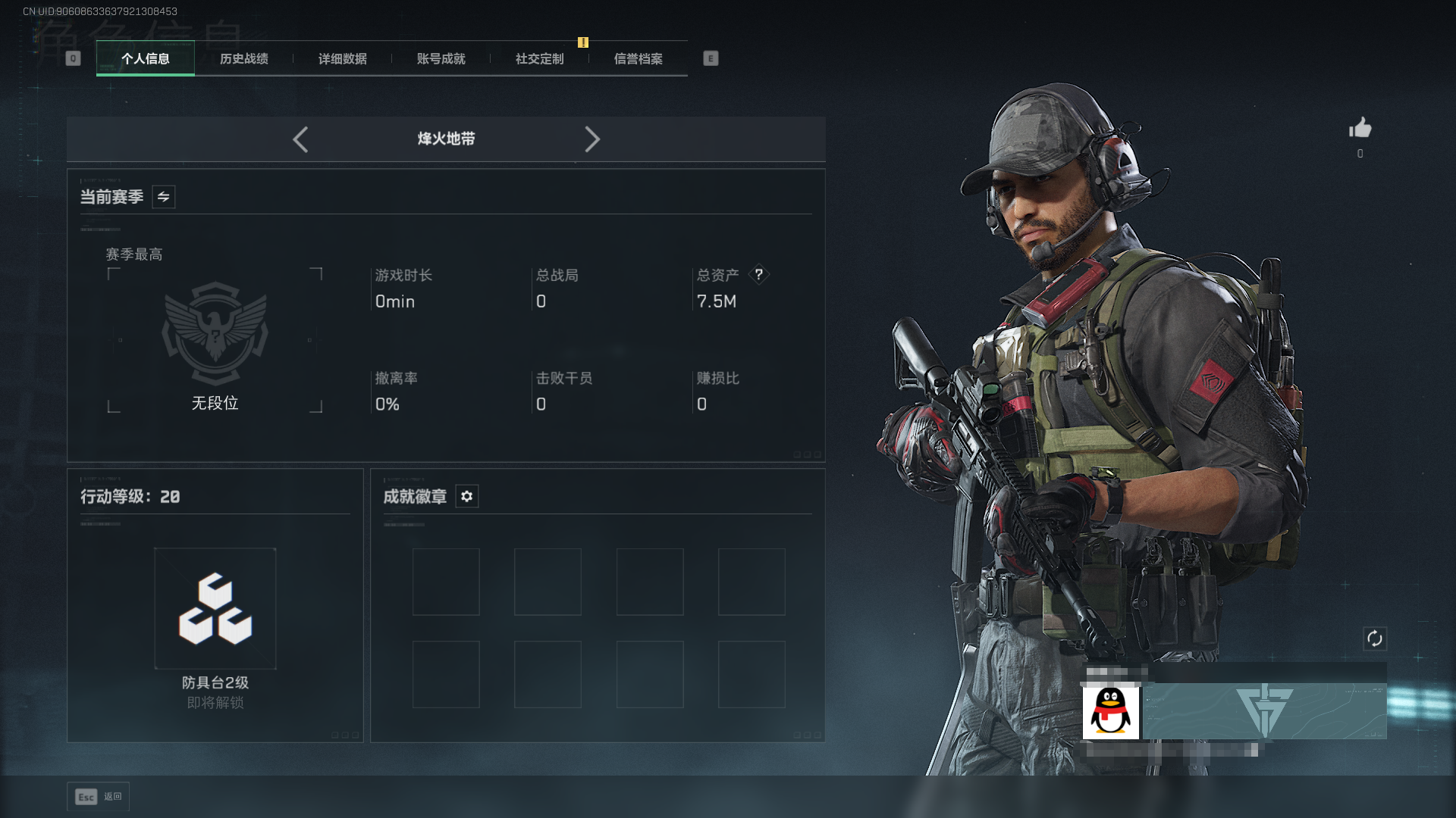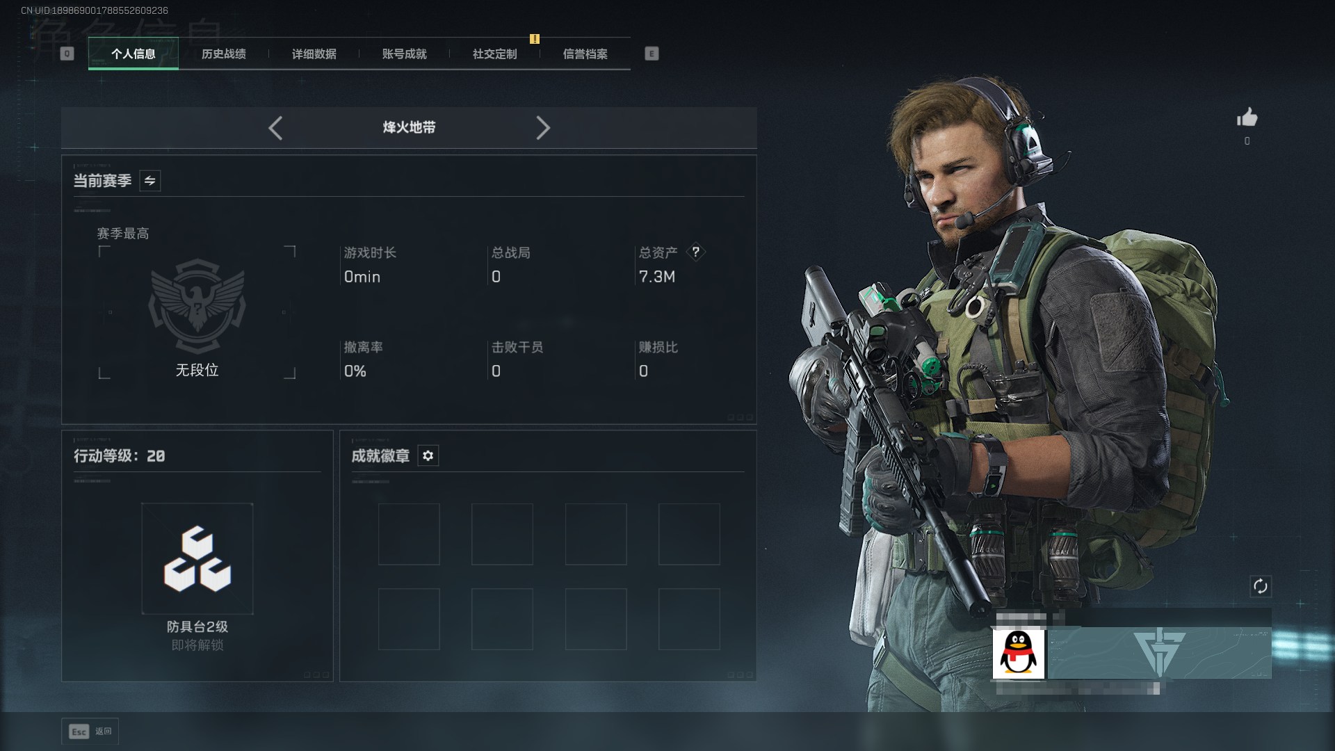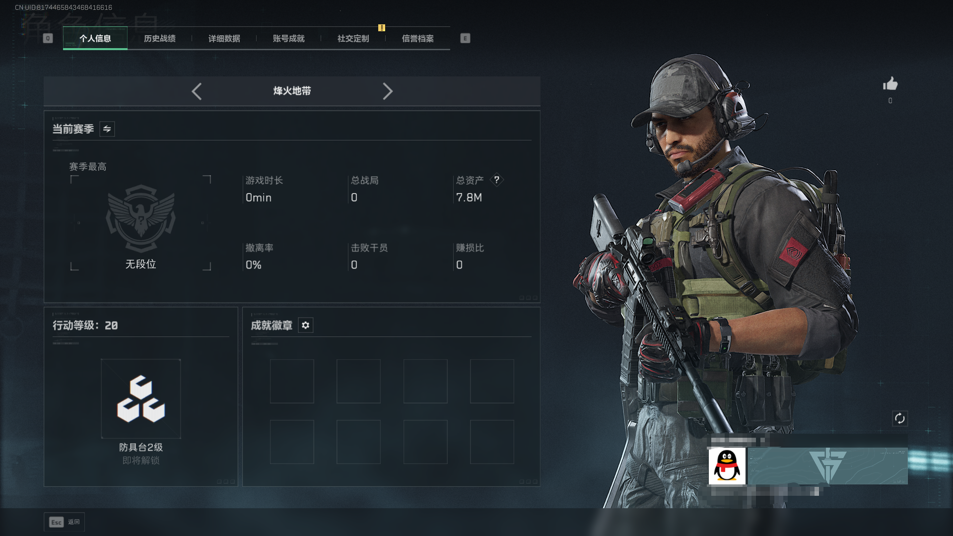 总资产7M-哈夫币3.000K-烽火地带等级-烽火地带段位20