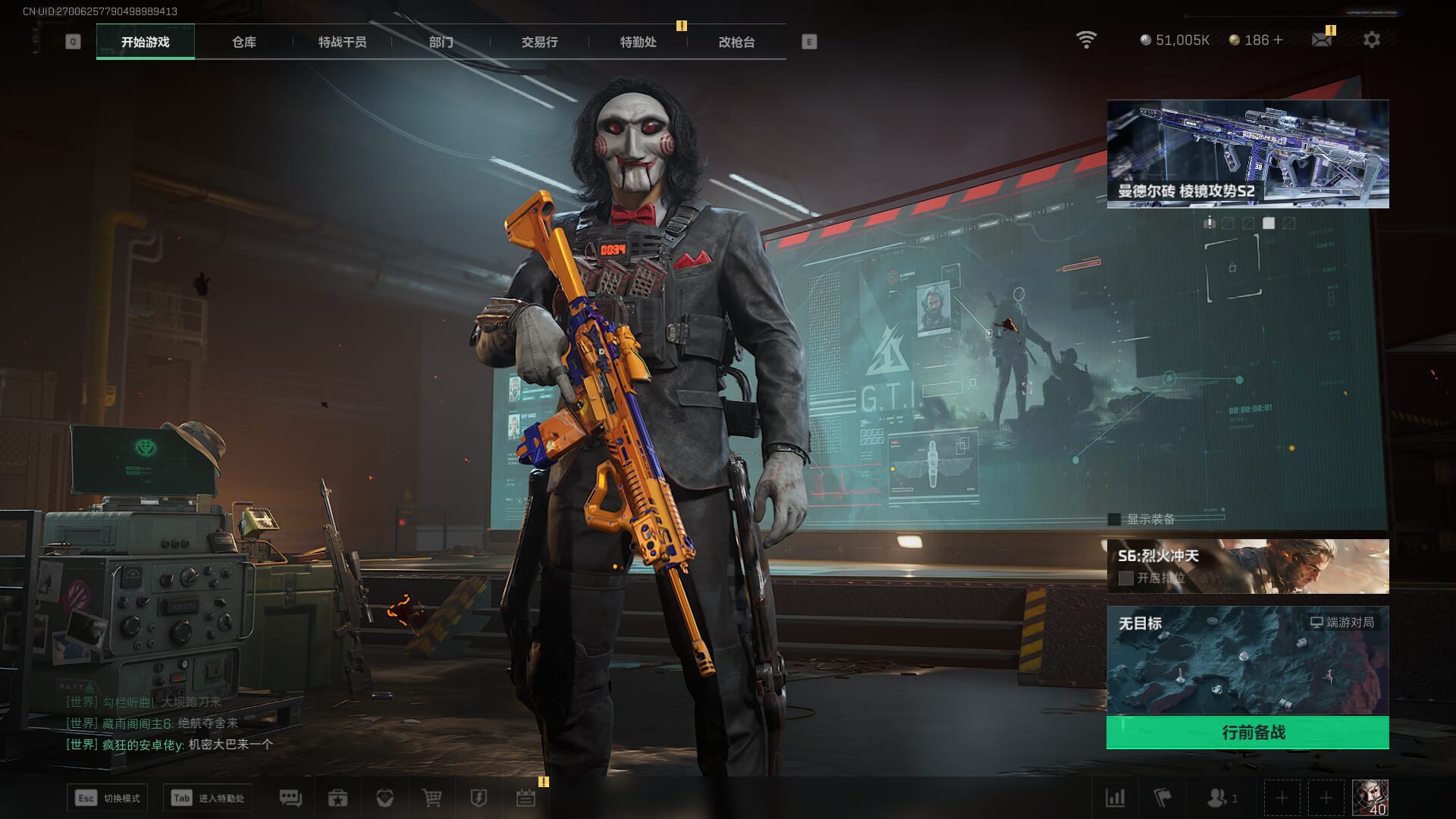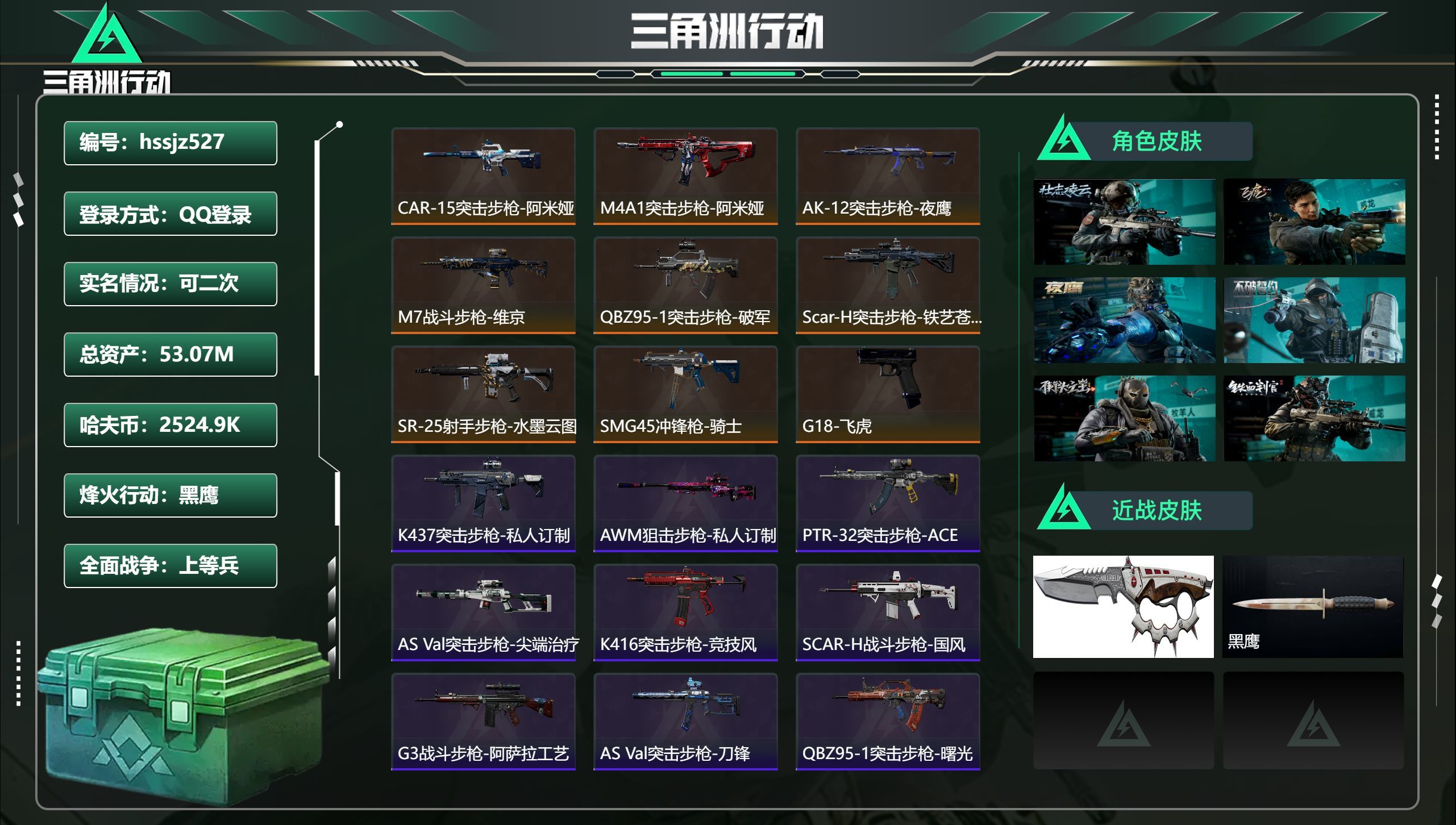总资产53.07M,哈夫币 2524.9K,战场等级:50 上等兵,行动等级:60 黑鹰,角色皮肤6