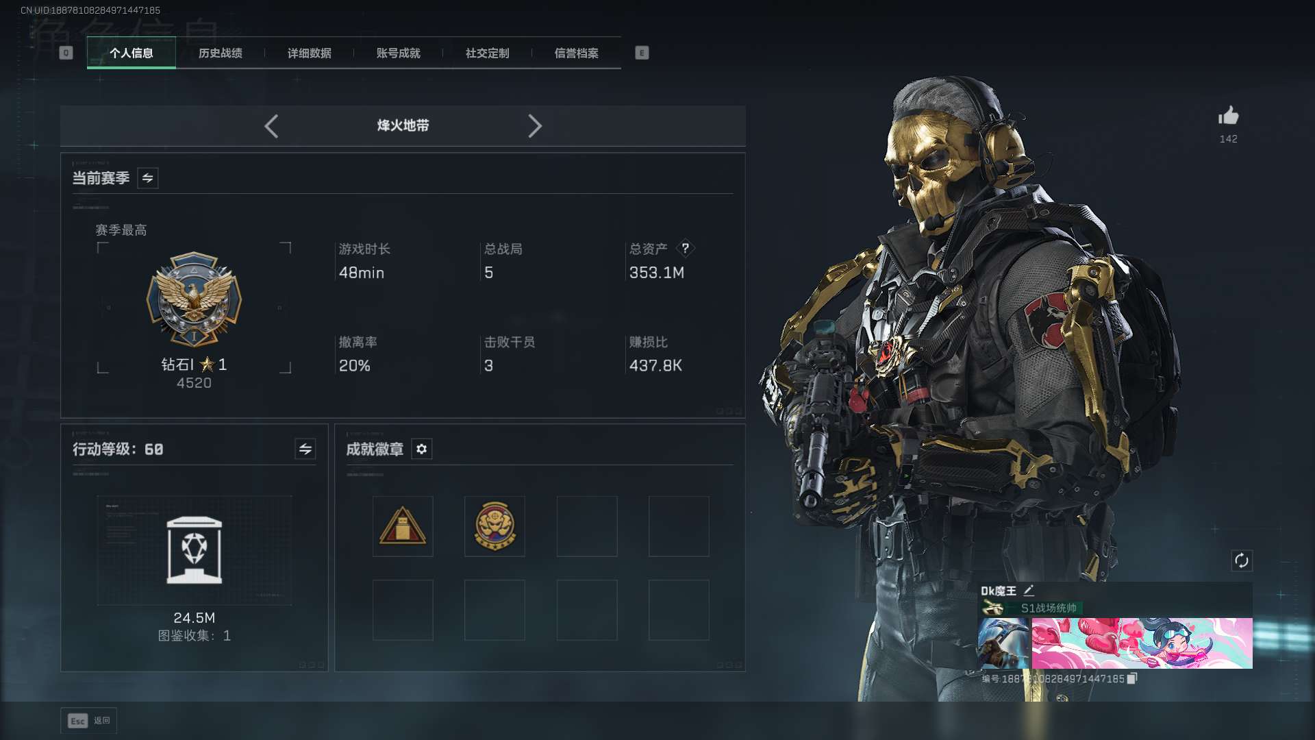 总资产200.49M,哈夫币 30074.93K,战场等级:50 军士长,行动等级:60 钻石,角色