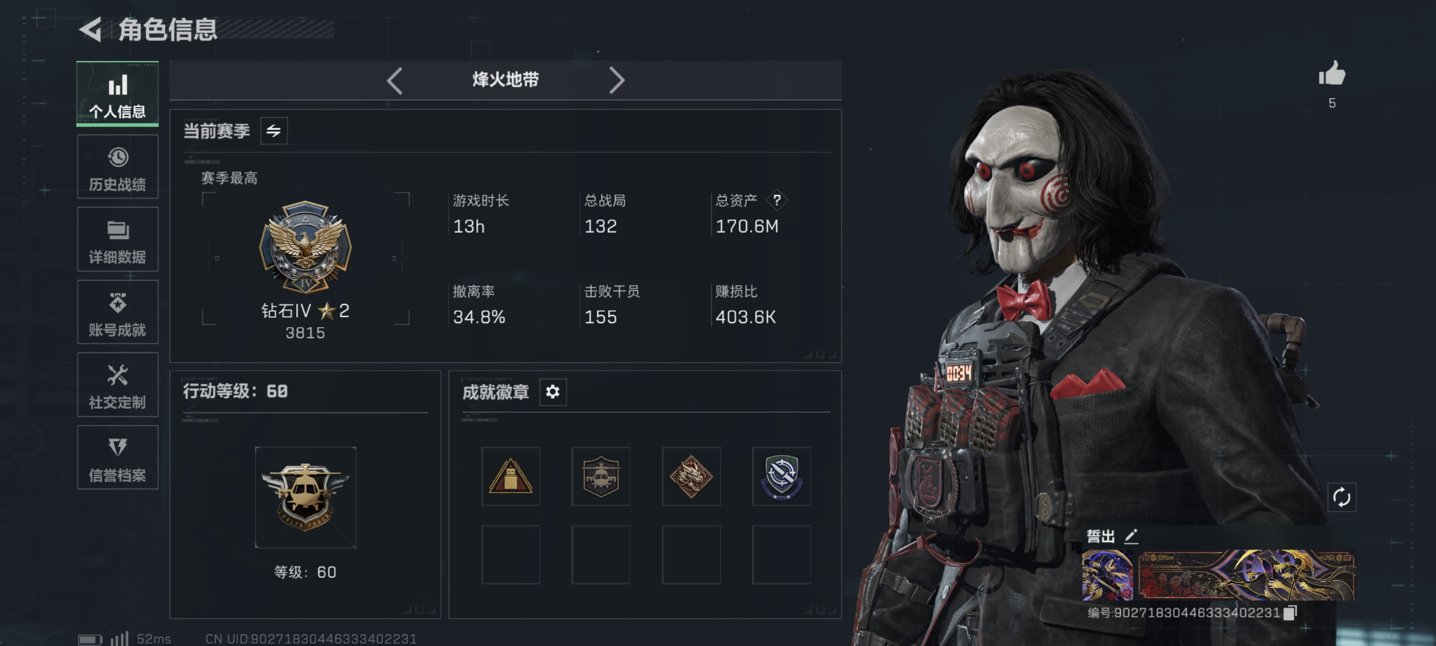 E9164/QQ区/可二次/钱包注销/总资产:142M,哈夫币:624W,武器皮肤170;烽火60级