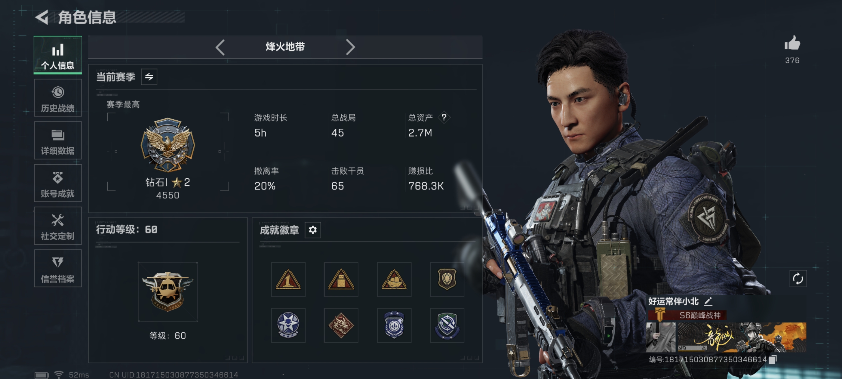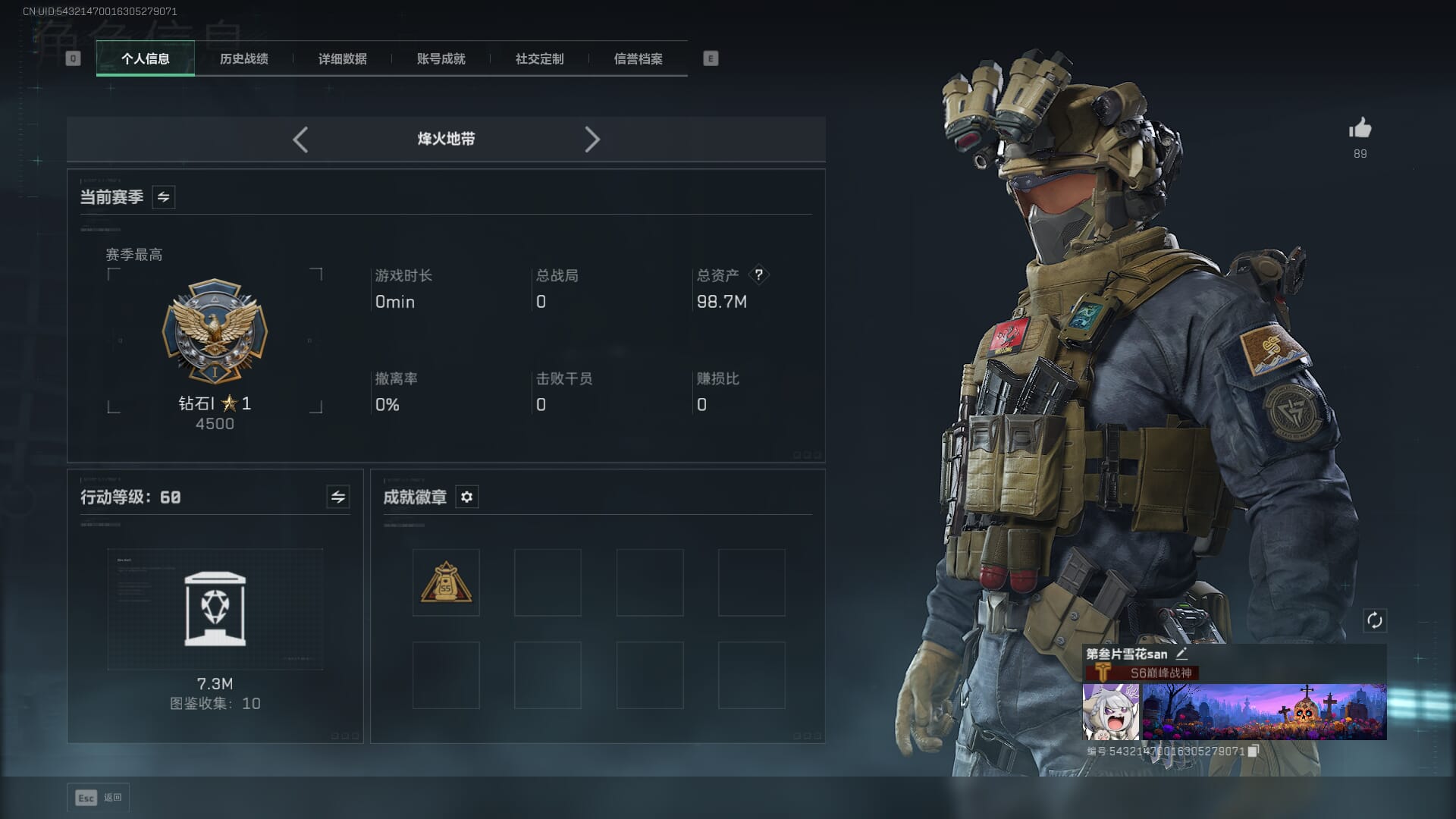 N6385/QQ/哈夫币9116W/总资产359.5M/行动等级60/战场等级2/s7赛季高级安全箱