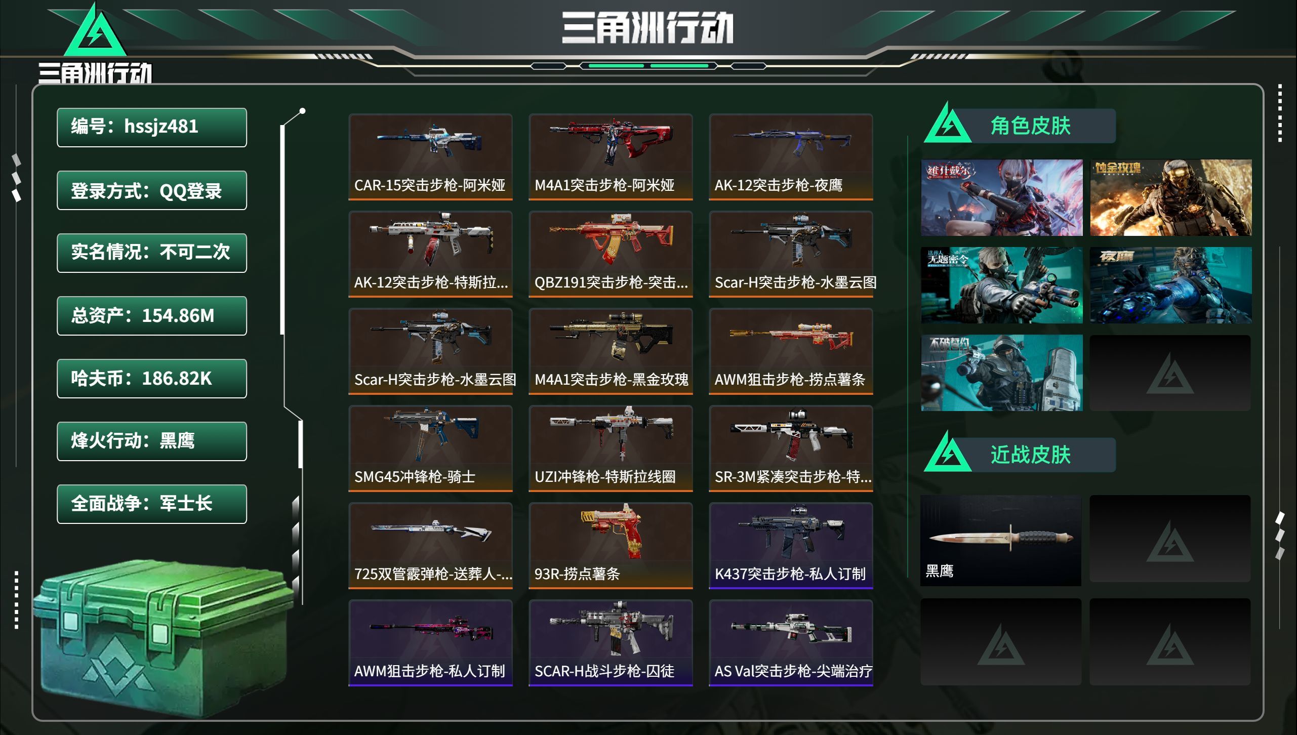 总资产154.86M,哈夫币 186.82K,战场等级:50 军士长,行动等级:60 黑鹰,角色皮肤