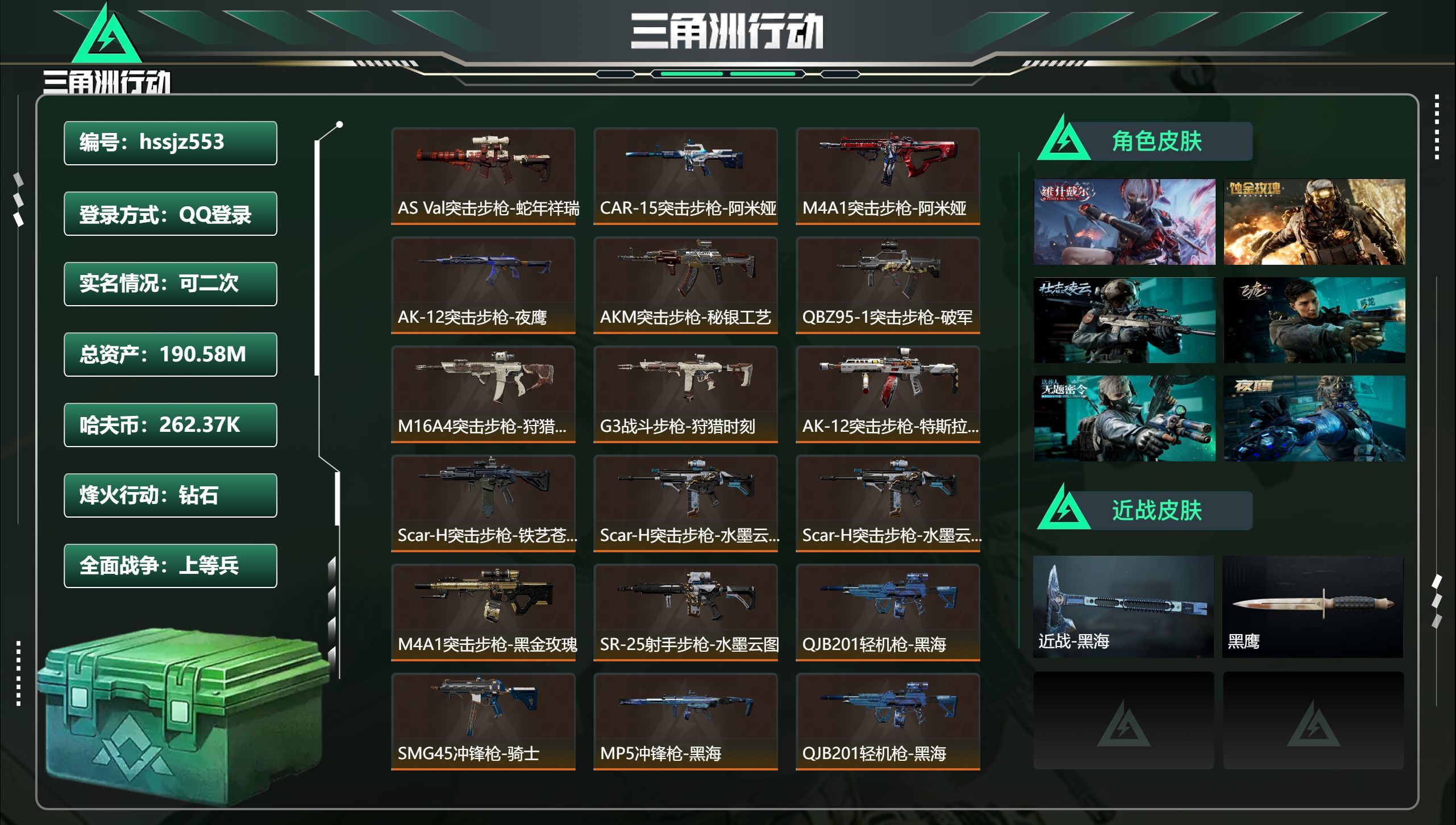 总资产267.2M,哈夫币 28553.27K,战场等级:41 列兵,行动等级:60 铂金,角色皮肤