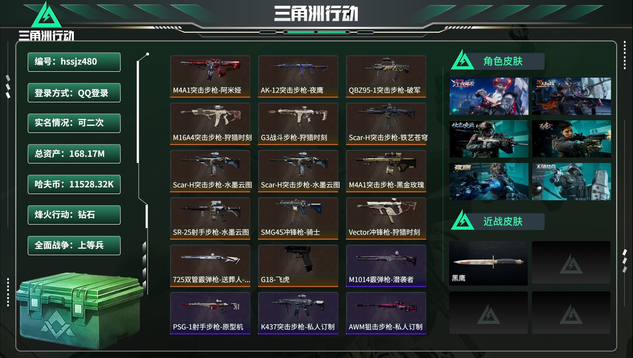 总资产168.17M,哈夫币 11528.32K,战场等级:40 上等兵,行动等级:60 钻石,角色
