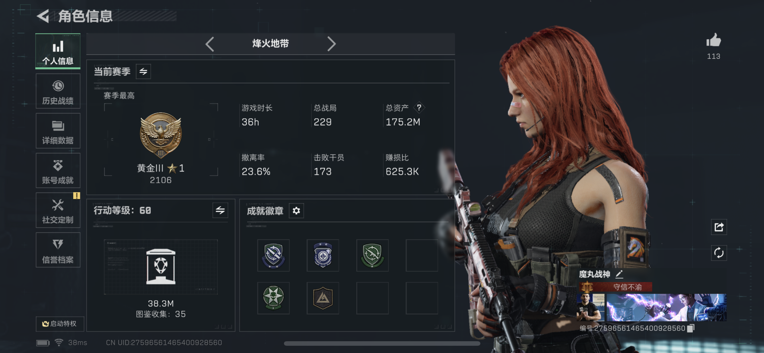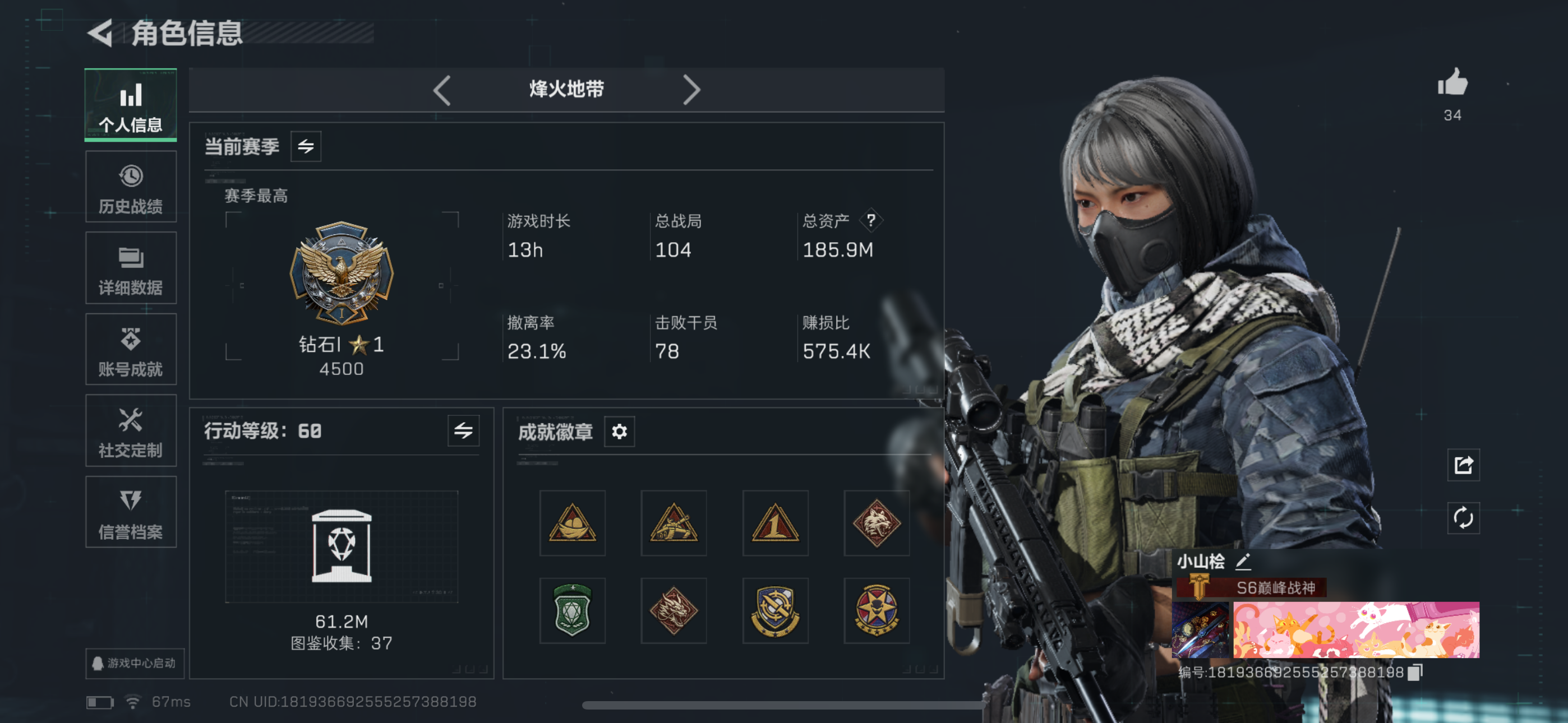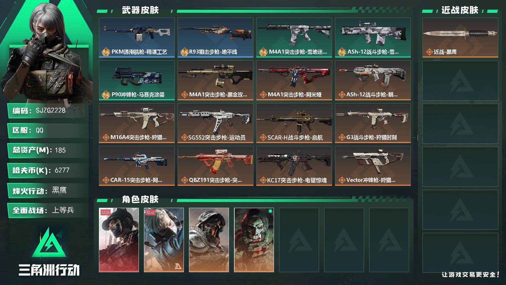总资产(M):185M/哈夫币(K):6277K/全面战场等级:25_段位:上等兵/烽火地带等级:60_段位:黑鹰/
