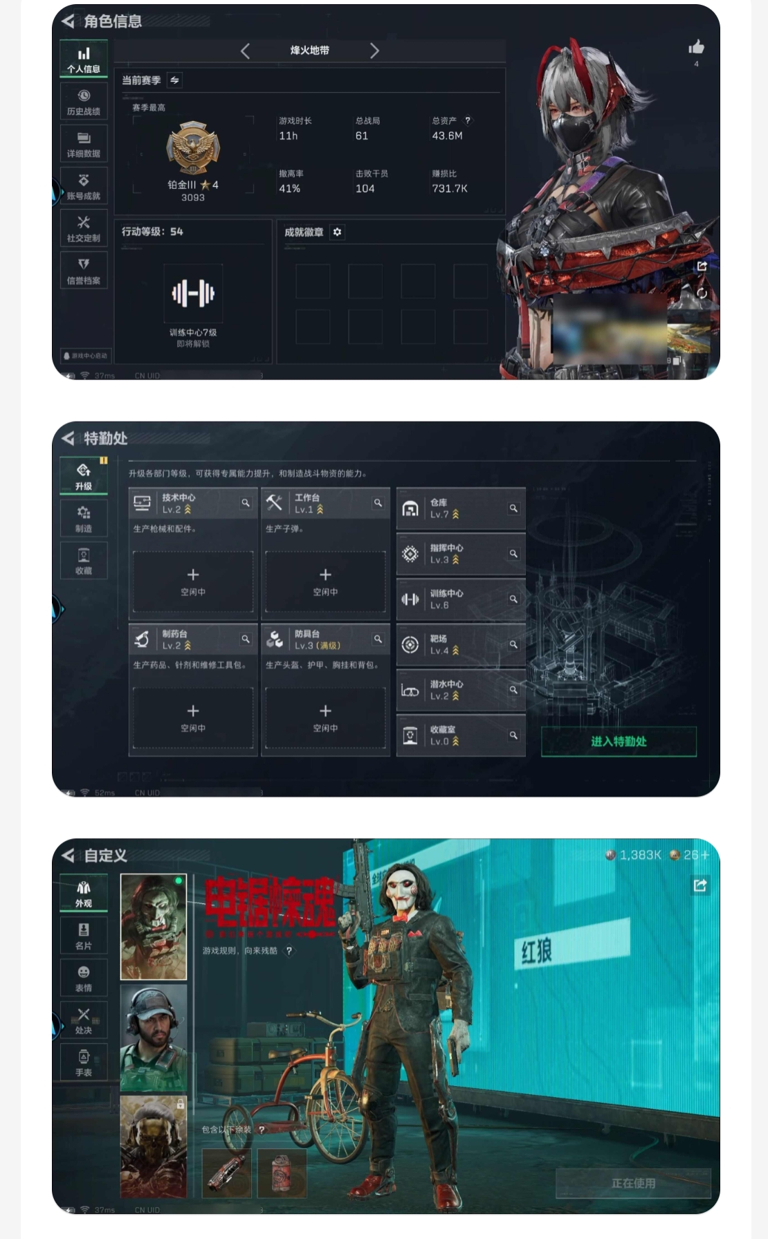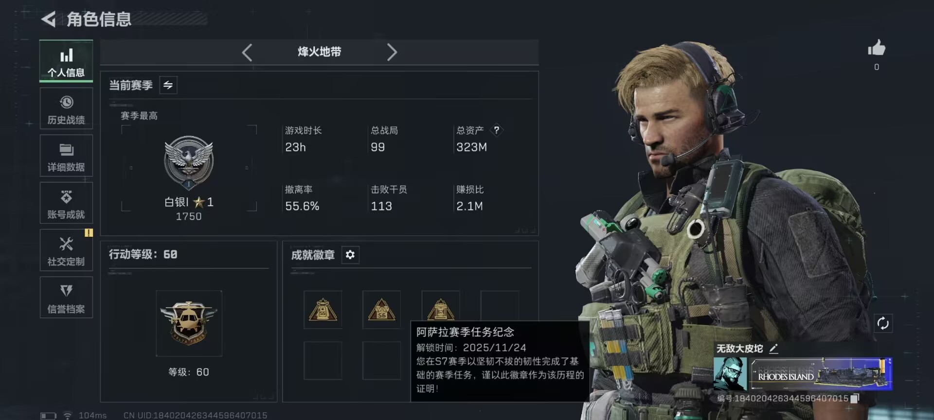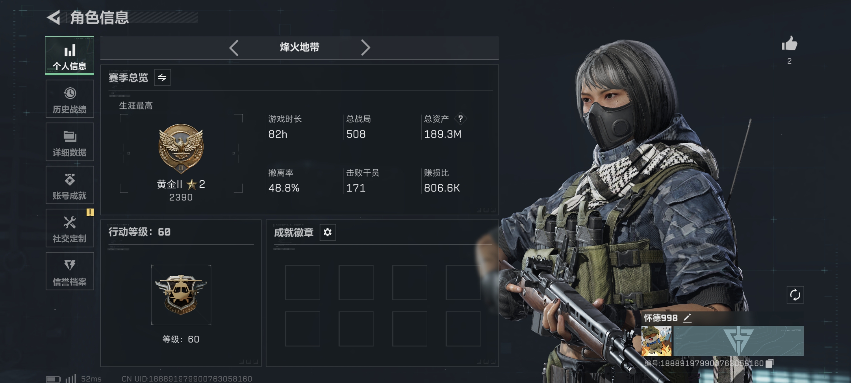 总资产(M):185M/哈夫币(K):6277K/全面战场等级:25_段位:上等兵/烽火地带等级:60_段位:黑鹰/