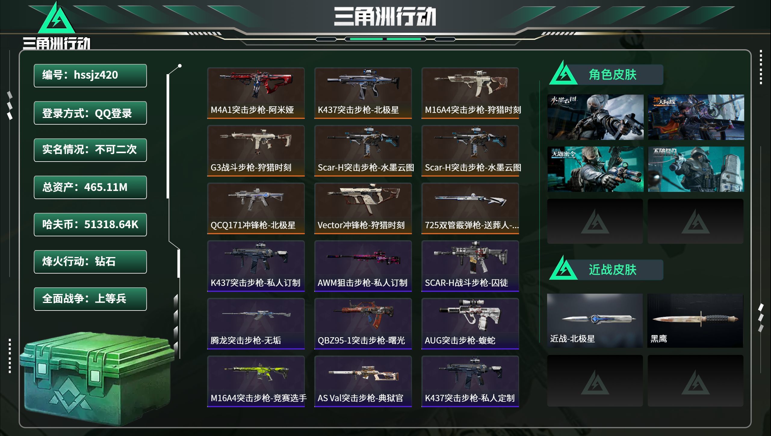 总资产465.11M,哈夫币 51318.64K,战场等级:22 上等兵,行动等级:60 钻石,角色